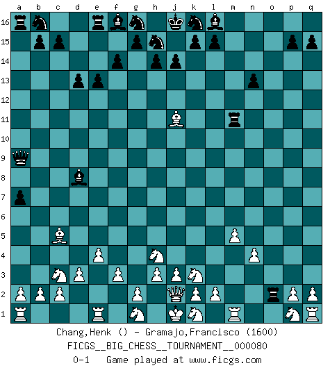 Last move : 0-1 2011 October 23 0:23:6 [Event "FICGS__BIG_CHESS__TOURNAMENT__000080"] [Site "FICGS"] [Date "2011.08.18"] [Round "1"] [White "Chang,Henk"] [Black "Gramajo,Francisco"] [Result "0-1"] [WhiteElo ""] [BlackElo "1600"] 1.j2-h4 d15-d13 2.h1-o7 j15-h13 3.o7-o15 p16-o14 4.o15-f7 f15-f14 5.n2-n4 e15-e13 6.f7-k3 n15-n13 7.k3-j2 m15-m13 8.o1-g8 a15-a13 9.e2-e4 a13-a12 10.f1-c4 o16-c5 11.f2-f3 a12-a11 12.d2-d3 a11-a10 13.c1-e3 c5-e7 14.h2-k3 a10-a9 15.m2-m4 a9-a8 16.m4-m5 a8-a7 17.b1-c3 o14-n12 18.g8-m13 n12-l11 19.m13-d5 q16-o16 20.l1-n3 h13-j11 21.h4-g6 e7-d8 22.e3-c5 l11-k9 23.n3-g9 m16-m11 24.d5-j10 c16-j10 25.c4-j10 h16-p9 26.j10-k9 p9-k9 27.g9-j11 o16-o2 28.g6-h4 k9-a9 0-1 This big chess game has been lost on time (started : 2011.08.18 23:11:13) Follow this game move after move (download)I give 98 percent of my mental energy to Chess. Others give only 2 percent. (Bobby Fischer) Du musst nicht gut spielen, es reicht, wenn du besser spielst als dein Gegner. (Anonymous) El Jaque al descubierto es el bombardero del tablero. (Reuben Fine) Soyez une menace à chaque fois que vous vous asseyez pour jouer. (Ken Smith) Every man's memory is his private literature. (Aldous Huxley)