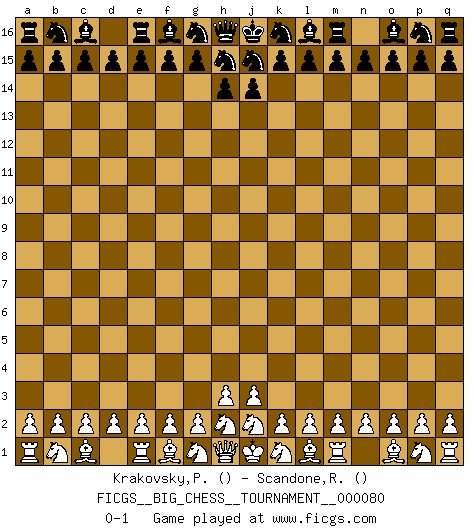 Last move : 0-1 2011 September 18 10:30:46 [Event "FICGS__BIG_CHESS__TOURNAMENT__000080"] [Site "FICGS"] [Date "2011.08.18"] [Round "1"] [White "Krakovsky,Peter"] [Black "Scandone,Raffaele"] [Result "0-1"] [WhiteElo ""] [BlackElo ""] 0-1 This big chess game has been lost on time (started : 2011.08.18 23:11:13) Follow this game move after move (download)Openings teach you openings. Endgames teach you chess ! (Stephan Gerzadowicz) Charakterschwächen offenbaren sich normalerweise während einer Schachpartie. (Garry Kasparov) Cuando tu casa esta en llamas, no puedes ser molestado por tus vecinos. O, como decinos en Ajedrez, si tu Rey esta bajo ataque, no te preocupa perder un Peón del lado de la Reina. (Gary Kasparov) Mon pion favori sur ma case favorite ! Bronstein en parlant d'un coup de pion en h5 quand il avait les Noirs. When I took office, only high energy physicists had ever heard of what is called the World Wide Web... Now even my cat has its own page. (Bill Clinton, 1996)