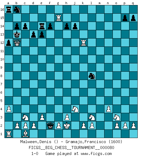 Last move : 1-0 2011 November 1 21:39:43 [Event "FICGS__BIG_CHESS__TOURNAMENT__000080"] [Site "FICGS"] [Date "2011.08.18"] [Round "1"] [White "Malween,Denis"] [Black "Gramajo,Francisco"] [Result "1-0"] [WhiteElo ""] [BlackElo "1600"] 1.m2-m4 j15-k13 2.m4-m5 m15-m13 3.g1-f3 n15-n13 4.k1-l3 o16-f8 5.j2-k4 f8-k4 6.j3-k4 h16-p9 7.h1-l4 b15-b14 8.p1-o3 c16-a14 9.l4-n4 p16-o14 10.l1-p5 e15-e13 11.m5-m6 c15-c14 12.n4-n13 q16-n16 13.n13-f6 f15-f14 14.b1-c3 f16-b12 15.f6-h4 l16-o13 16.n2-n4 n16-n11 17.h4-j4 n11-j11 18.p5-j11 k13-j11 19.j4-j11 b12-k4 20.j11-k11 k4-h2 21.f3-h2 p9-j9 22.h2-j4 o13-h7 23.o1-h7 a14-h7 24.m1-m4 m16-m14 25.k11-p11 o14-n12 26.p11-o11 m14-o14 27.o11-k11 e16-e14 28.k11-m13 o14-m14 29.m13-o15 m14-m6 30.m4-k4 a15-a13 31.o15-l15 h7-k9 32.e2-e3 n12-m10 33.f1-d3 h15-j13 34.j1-h2 a13-a12 35.q1-m1 m10-l8 36.d3-k9 m6-m1 37.e1-m1 j9-f6 38.m1-m16 j13-l14 39.k9-n12 j16-h15 40.k4-k15 g16-j15 41.m16-k16 h15-g14 42.n12-l14 j15-l14 43.k15-g15 g14-f13 44.l15-l14 f6-f2 45.l14-h11 f13-e12 46.k16-k12 e12-d13 47.h11-d11 d13-c13 48.a2-a4 d15-d13 49.d11-a11 c13-b13 50.a11-b12 1-0 Follow this game move after move (download)Chess is a fairy tale of 1001 blunders. (Savielly Tartakower) Wenn ich gewinne bin ich ein Genie. Wenn nicht, dann bin ich keines. (Robert James Fischer) Hoy en día, si tu no eres un Gran Maestro a los 14 años, es mejor que lo olvides. (Anand Viswanathan) Votre seul travail dans les ouvertures est d'obtenir un milieu de partie jouable. (Lajos Portish) When it is a question of money, everybody is of the same religion. (Voltaire)