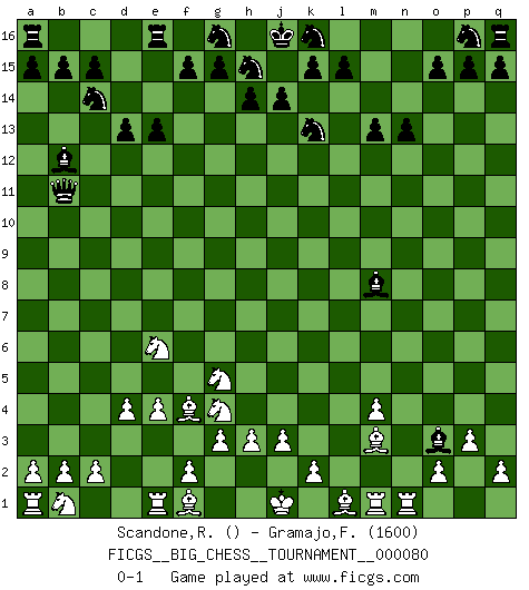 Last move : 0-1 2011 October 17 12:11:14 [Event "FICGS__BIG_CHESS__TOURNAMENT__000080"] [Site "FICGS"] [Date "2011.08.18"] [Round "1"] [White "Scandone,Raffaele"] [Black "Gramajo,Francisco"] [Result "0-1"] [WhiteElo ""] [BlackElo "1600"] 1.g1-f3 d15-d13 2.j2-k4 e15-e13 3.d2-d4 f16-b12 4.k4-h5 n15-n13 5.p1-o3 m15-m13 6.m2-m4 l16-p12 7.h5-f4 j15-k13 8.n2-n4 o16-f8 9.f4-e6 f8-j5 10.c1-e3 c16-l8 11.f3-g5 h16-l13 12.h1-l4 b16-c14 13.h2-g4 j5-m8 14.k1-h2 m16-m14 15.e3-f4 m14-l14 16.o1-m3 l13-p9 17.p2-p3 l8-p4 18.m3-n2 l14-l4 19.n2-l4 p4-o3 20.e2-e4 p12-g4 21.h2-g4 p9-n9 22.g2-g3 n9-n4 23.q1-n1 n4-l2 24.l4-m3 l2-b11 0-1 This big chess game has been lost on time (started : 2011.08.18 23:11:13) Follow this game move after move (download)Capture of the adverse King is the ultimate but not the first object of the game. (William Steinitz) Nur ein wirklich starker Spieler weiß wie schwach er spielt. (Savielly Grigorievitsch Tartakower) Los Peones son el alma de una partida de Ajedrez. (Francois Andre Danican Philidor) Les Echecs sont et restent toujours un combat, un combat intégral comme la boxe, la lutte ou un autre sport, et où il doit y avoir un vainqueur et un vaincu. (Joseph Emil Diemer) 'preceded by its own quotation yields a falsehood' preceded by its own quotation yields a falsehood. (W. V. O. Quine - Set Theory And Its Logic, 1953)