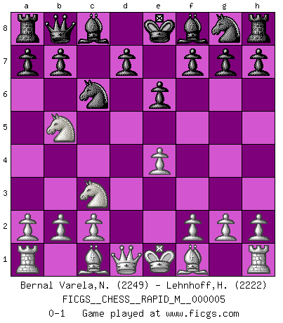 Last move : 0-1 2007 February 19 11:7:49 [Event "FICGS__CHESS__RAPID_M__000005"] [Site "FICGS"] [Date "2007.01.01"] [Round "1"] [White "Bernal Varela,Nelson"] [Black "Lehnhoff,Heinz-Georg"] [Result "0-1"] [WhiteElo "2249"] [BlackElo "2222"] 1.e4 c5 2.Nf3 e6 3.d4 cxd4 4.Nxd4 Nc6 5.Nc3 Qc7 6.Ndb5 Qb8 0-1 This chess game has been lost on time (started : 2007.01.01 23:9:0) Sicilian : Taimanov (Bastrikov) variation Player Black won this chess game. Follow this game move after move (download)The way he plays Chess demonstrates a man's whole nature. (Stanley Ellin) Offener Brief an US-Präsident Bush anlässlich der Verhaftung Bobby Fishers: Verhaften Sie mich. Stecken Sie mich in dieselbe Zelle wie Bobby Fisher und geben Sie uns ein Schachspiel mit. (Boris Vassilievich Spassky) Morphy probablemente fue el genio más grande de todos. (Bobby Fischer) On n'a jamais que l'âge auquel on a commence à jouer aux échecs car après on cesse de vieillir. (Capablanca) Internet: Absolute communication, absolute isolation. (Paul Carvel)