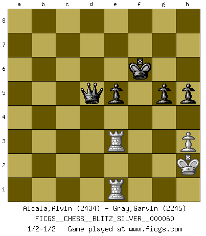 Last move : 1/2-1/2 2011 August 19 12:45:52 [Event "FICGS__CHESS__BLITZ_SILVER__000060"] [Site "FICGS"] [Date "2011.08.19"] [Round "1"] [White "Alcala,Alvin"] [Black "Gray,Garvin"] [Result "1/2-1/2"] [WhiteElo "2434"] [BlackElo "2245"] 1.e4 e5 2.Nf3 Nc6 3.Bb5 a6 4.Ba4 Nf6 5.O-O Be7 6.Re1 b5 7.Bb3 O-O 8.a3 d6 9.d3 Bg4 10.c3 d5 11.h3 Bh5 12.Qe2 Bxf3 13.Qxf3 d4 14.Nd2 Qd6 15.Qe2 Rad8 16.c4 Nd7 17.cxb5 axb5 18.Nf1 Nc5 19.Bd5 Bf6 20.g3 Nb8 21.Nh2 c6 22.Ba2 Nbd7 23.f4 Rde8 24.f5 Ra8 25.b3 Ra7 26.Qc2 h6 27.Nf3 Rfa8 28.g4 b4 29.a4 Qe7 30.Bd2 Rb8 31.Bb1 Nb7 32.Kg2 Na5 33.Rh1 Bh4 34.Ba2 c5 35.Raf1 c4 36.dxc4 Ra6 37.Nxh4 Qxh4 38.Qd1 Nc5 39.Qf3 Qe7 40.Rd1 d3 41.Be3 Naxb3 42.Bxb3 Nxb3 43.Rxd3 Nc5 44.Rd2 b3 45.Bxc5 Qxc5 46.Rb2 Rxa4 47.Rhb1 Qa5 48.Qd3 Rd8 49.Qe3 Rxc4 50.Rxb3 Rc2+ 51.Kg3 R8d2 52.Qf3 Kh7 53.g5 Rf2 54.g6+ fxg6 55.fxg6+ Kxg6 56.Qxf2 Rxf2 57.Kxf2 Qd2+ 58.Kg1 Qd4+ 59.Kh2 Qf2+ 60.Kh1 Kh7 61.R1b2 Qf1+ 62.Kh2 Qf4+ 63.Kg1 Qxe4 64.Rg2 Qd4+ 65.Kh2 g5 66.Re2 Kg6 67.Rbe3 Kf5 68.Rf2+ Ke6 69.Rfe2 h5 70.Kg2 Qd5+ 71.Kh2 Kf5 72.Rf2+ Kg6 73.Rfe2 Qd6 74.Kg2 Kf5 75.Rf3+ Ke6 76.Rfe3 Qc7 77.Re1 Qc6+ 78.Kh2 Qd6 79.Kg2 Qd5+ 80.Kh2 Kf5 81.Rf1+ Kg6 82.Rfe1 Kf6 1/2-1/2 Sergey Biryukov I dont understand why black cannot win...Why is a draw? Black has a great chances to win. Alvin would resign but not offer a draw! Garvin Gray How does black win this position? Please demonstrate ! Sergey Biryukov Yes. I found a draw.Black cannot win. Ruy Lopez : Closed, 7...O-O Kingside Castling by player White (move 5) Kingside Castling by player Black (move 7) 10 pieces endgame at move 57 : White KRRPP , Black KQPPP WHITE : King + 2 Rooks 2 Pawns BLACK : King + 1 Queen 3 Pawns 9 pieces endgame at move 63 : White KRRP , Black KQPPP WHITE : King + 2 Rooks 1 Pawn BLACK : King + 1 Queen 3 Pawns This chess game ended in a draw. Follow this game move after move (download)I feel as if I were a piece in a game of Chess, when my opponent says of it: That piece cannot be moved. (Soren Kierkegaard) Im Blitz ist es einfacher mit einer Figur weniger anzugreifen, als sich mit einer Mehrfigur zu verteidigen. (Mikhail Nekhemyevich Tal) Las Aperturas te enseñan aperturas. ¡Los Finales te enseñan Ajedrez!. (Stephan Gerzadowicz) Les échecs sont un jeu par leur forme, un art par leur essence et une science par sa difficulté d'acquisition. Ils peuvent vous procurer autant de plaisir qu'un bon livre ou une belle musique, mais vous n'aurez une réelle joie que si vous arrivez à bien jouer. (Tigran Petrosian) A woman without a man is like a fish without a bicycle. (Gloria Steinem)