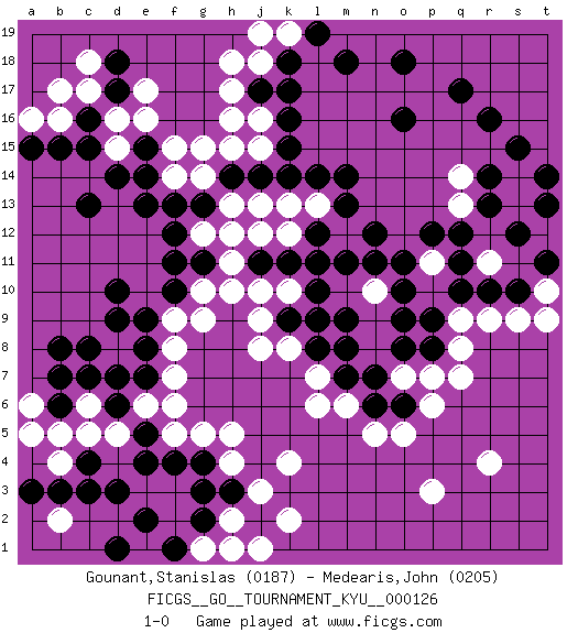 Last move : 1-0 2011 October 19 1:32:19 [Event "FICGS__GO__TOURNAMENT_KYU__000126"] [Site "FICGS"] [Date "2011.08.21"] [Round "1"] [Black "Gounant,Stanislas"] [White "Medearis,John"] [Result "1-0"] [Rating 1 "0187"] [Rating 2 "0205"] 1.d3 p3 2.q17 d16 3.k16 k4 4.d10 k10 5.q10 r4 6.m11 h11 7.f11 g9 8.l9 k8 9.k9 j9 10.l10 j10 11.k11 j8 12.e8 f7 13.e7 f5 14.e5 j13 15.j14 k12 16.l12 k13 17.k15 g10 18.g13 g12 19.f12 h13 20.g11 h12 21.j11 g14 22.f13 f14 23.h14 h10 24.f10 f9 25.e9 e6 26.d6 j12 27.l11 f6 28.f4 f8 29.e4 h4 30.k14 l13 31.m14 n9 32.m8 n11 33.m13 n8 34.l8 l7 35.m7 m6 36.n7 o7 37.n6 l6 38.o6 p6 39.n12 m10 40.l14 p11 41.o11 n10 42.o8 p7 43.o9 n5 44.o10 o5 45.q12 h16 46.m9 q9 47.p8 q8 48.p9 q7 49.r10 r9 50.s10 s9 51.p12 h15 52.g4 g5 53.h3 j3 54.j2 h2 55.g3 k2 56.g2 j1 57.m18 j18 58.k18 j16 59.j17 h17 60.k17 h18 61.e14 g15 62.e15 e16 63.c15 d15 64.d14 f15 65.c13 g1 66.f1 h1 67.e2 d7 68.c7 d8 69.d9 c6 70.c8 d5 71.d7 c5 72.b6 b5 73.b8 a5 74.c4 a6 75.b7 b4 76.b3 e1 77.d1 t10 78.t11 t9 79.s12 r11 80.q11 j19 81.c16 c17 82.d17 e17 83.d18 c18 84.r16 k19 85.l19 b16 86.b15 b17 87.a15 a16 88.e13 b2 89.a3 h5 90.c3 j15 91.o16 n10 92.n11 q14 93.r13 s14 94.r14 s13 95.s15 t12 96.t13 q13 97.t14 pass 98.o18 1-0 Here are the names of the openings (joseki) played in the four corners : Corner d4 : d3 g9 Komoku (Somok, Xiao~mu`) 3-4 Point. The komoku (3-4) point is the traditional corner enclosure move.. Player Black won this Go (weiqi, baduk) game. Follow this game move after move (download)Don't make dango's. (Anonymous) The human is the only animal species whose members are able to talk themselves into difficulties that would not otherwise exist. (Wendell Johnson)