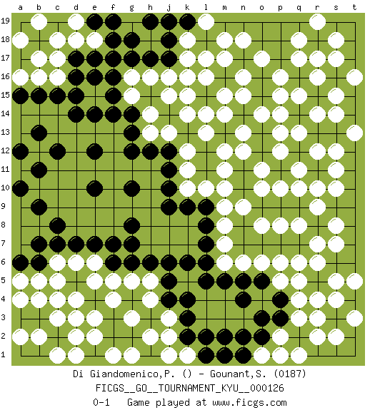 Last move : 0-1 2011 December 20 15:59:26 [Event "FICGS__GO__TOURNAMENT_KYU__000126"] [Site "FICGS"] [Date "2011.08.21"] [Round "1"] [Black "Di Giandomenico,Pierino"] [White "Gounant,Stanislas"] [Result "0-1"] [Rating 2 "0187"] 1.g8 c4 2.j5 q3 3.c8 c16 4.g14 q17 5.n17 k16 6.q12 p16 7.p6 m17 8.n14 n16 9.f2 d3 10.o3 o14 11.l15 l14 12.g17 k15 13.k13 m15 14.j18 n18 15.q14 n13 16.g12 o17 17.r15 r16 18.s16 q15 19.r18 s17 20.q9 s15 21.s13 r14 22.l18 q13 23.p11 p12 24.e16 s4 25.n2 r6 26.q7 d6 27.o5 r12 28.r11 q11 29.n4 q10 30.r8 r10 31.m1 o10 32.s9 s10 33.p9 p10 34.t9 r9 35.o9 n9 36.n8 m8 37.n7 m7 38.l6 m6 39.m5 n6 40.l7 m9 41.l8 o6 42.o12 o11 43.l11 k10 44.l9 l10 45.k9 k11 46.j9 m10 47.j10 j13 48.j11 k12 49.j12 h14 50.h12 g15 51.g13 j15 52.f15 l17 53.f16 g16 54.g18 k18 55.p4 o8 56.c15 c17 57.j17 l19 58.j19 h16 59.q5 r7 60.h17 j16 61.t10 s8 62.t11 s11 63.t12 q6 64.d16 d18 65.b15 b16 66.a15 a16 67.d17 e18 68.f18 q8 69.p7 p8 70.o7 p5 71.t8 s7 72.t7 p6 73.t6 q4 74.r5 s5 75.s3 r3 76.p3 p2 77.p1 q1 78.q2 r2 79.s6 o1 80.m2 t16 81.d14 r4 82.f19 c18 83.e17 s12 84.r5 q5 85.r13 s14 86.p14 p15 87.o13 p13 88.q14 n12 89.k19 m18 90.e19 d19 91.d15 t13 92.o2 h13 93.n5 f5 94.e4 e3 95.f3 f4 96.g4 e5 97.g6 g5 98.h6 d4 99.e2 d2 100.e1 d1 101.g7 h4 102.j4 g3 103.g2 h2 104.h1 j2 105.j1 k1 106.k2 g1 107.h3 j3 108.l1 j1 109.k3 h5 110.d7 f1 111.b6 c6 112.c7 c5 113.e7 t5 114.a6 k17 115.f6 e6 116.f7 b5 117.b7 a5 118.j6 q18 119.l2 k14 120.f17 p1 121.n1 s18 122.f14 l13 123.k4 l16 124.l12 m12 125.c12 m11 126.k6 b19 127.e14 a18 128.b13 p14 129.e12 b2 130.b11 r19 131.e10 r17 132.b9 m14 133.g10 n15 134.b3 a2 135.pass pass 136.pass s2 137.e1 e2 138.c2 c3 139.a3 c1 140.l5 t3 141.pass pass 142.pass b4 143.a12 a4 144.h19 b17 145.a10 pass 146.pass 0-1 Here are the names of the openings (joseki) played in the four corners : Corner d4 : g8 c4 This joseki is unknown. A weak or weird move has probably been played in this corner. Corner d16 : c16 g14 Komoku (Somok, Xiao~mu`) 3-4 Point. The komoku (3-4) point is the traditional corner enclosure move.. Corner q16 : q17 n17 Komoku (Somok, Xiao~mu`) 3-4 Point. The komoku (3-4) point is the traditional corner enclosure move.. Corner q4 : q3 p6 Komoku (Somok, Xiao~mu`) 3-4 Point. The komoku (3-4) point is the traditional corner enclosure move.. Player White won this Go (weiqi, baduk) game. Follow this game move after move (download)Six eyes in a rectangle are alive. (Anonymous) Convictions are more dangerous enemies of truth than lies. (Friedrich Nietzsche)