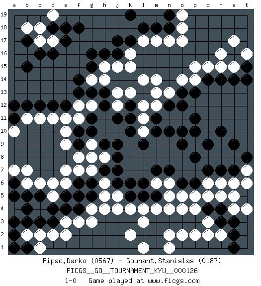 Last move : 1-0 2011 November 11 19:34:12 [Event "FICGS__GO__TOURNAMENT_KYU__000126"] [Site "FICGS"] [Date "2011.08.21"] [Round "1"] [Black "Pipac,Darko"] [White "Gounant,Stanislas"] [Result "1-0"] [Rating 1 "0567"] [Rating 2 "0187"] 1.d4 r16 2.d16 q3 3.r10 k16 4.j17 l17 5.g16 k4 6.k10 h15 7.j16 j15 8.l18 m17 9.m18 o18 10.n18 n17 11.k17 m14 12.o13 p14 13.p13 n13 14.n12 m12 15.m11 n11 16.o12 m13 17.n10 o11 18.p11 r6 19.o6 p5 20.q7 l11 21.m10 l10 22.l9 l12 23.j9 p9 24.o10 o14 25.q14 q15 26.r14 r15 27.s14 m6 28.m7 n6 29.n7 o5 30.p6 q6 31.r7 s6 32.s7 t7 33.t8 t6 34.k6 j5 35.j6 h6 36.h7 f7 37.f6 g7 38.g8 h8 39.j7 g9 40.h9 f8 41.j8 g8 42.g6 h5 43.g5 e6 44.e5 d6 45.c5 c6 46.b5 d5 47.f4 g4 48.f5 f3 49.e4 e3 50.d3 d2 51.c3 c2 52.b3 b2 53.a2 b6 54.a6 a7 55.a5 b7 56.b4 g3 57.a3 h11 58.g10 h10 59.g11 j10 60.k11 j12 61.k12 k13 62.h12 j13 63.j11 g12 64.h13 h14 65.g13 f12 66.f13 f11 67.f10 e11 68.e12 e10 69.f9 e9 70.d12 d11 71.c12 c11 72.b12 b11 73.a11 a10 74.a12 s15 75.t15 t16 76.t14 s17 77.k5 h4 78.l5 n5 79.l6 l4 80.m5 m4 81.g15 g14 82.f14 k15 83.h16 l14 84.k19 o19 85.n19 o17 86.b1 c1 87.a1 e2 88.n3 n2 89.o3 o2 90.p3 p2 91.m3 n4 92.m2 l3 93.l2 k2 94.q4 q5 95.m1 p4 96.r4 q2 97.r3 r2 98.s2 n1 99.s1 s4 100.s3 t4 101.p8 r5 102.q9 j4 103.o9 s5 104.p10 e7 105.b15 o4 106.s9 l1 107.f18 p15 108.pass c18 109.d18 c17 110.b17 b18 111.c16 d17 112.e17 d19 113.e18 1-0 Here are the names of the openings (joseki) played in the four corners : Player Black won this Go (weiqi, baduk) game. Follow this game move after move (download)Josekis are not fixed, definitive things. They indicate the moments when everything can change. (Pierre Audouard) Those parts of the system that you can hit with a hammer (not advised) are called hardware; those program instructions that you can only curse at are called software. (Anonymous)