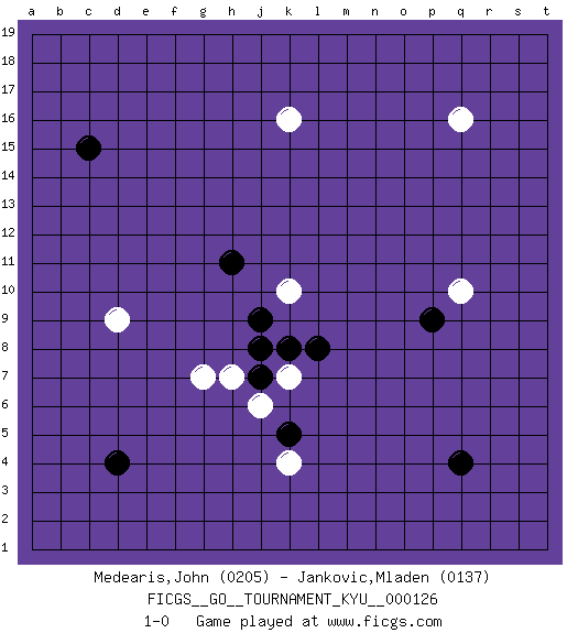 Last move : 1-0 2011 October 3 23:21:16 [Event "FICGS__GO__TOURNAMENT_KYU__000126"] [Site "FICGS"] [Date "2011.08.21"] [Round "1"] [Black "Medearis,John"] [White "Jankovic,Mladen"] [Result "1-0"] [Rating 1 "0205"] [Rating 2 "0137"] 1.q4 k10 2.l8 q10 3.p9 q16 4.d4 d9 5.c15 k16 6.h11 g7 7.j9 h7 8.j7 k4 9.k5 k7 10.k8 j6 11.j8 1-0 This go game has been lost on time (started : 2011.08.21 13:56:19) Here are the names of the openings (joseki) played in the four corners : Corner d4 : d4 d9 Hoshi (Hwajeom, Seongjeom, Xingwei`) 4-4 Point. The star or hoshi (4-4) point, emphasizing influence at the potential expense of territory. Player Black won this Go (weiqi, baduk) game. Follow this game move after move (download)Don't make empty triangles. (Anonymous) Watch your thoughts; they become words. Watch your words; they become actions. Watch your actions; they become habits. Watch your habits; they become character. Watch your character; it becomes your destiny. (Frank Outlaw)