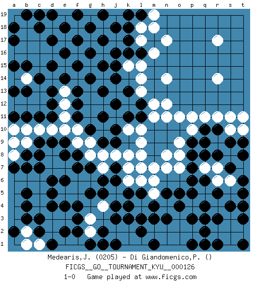 Last move : 1-0 2012 February 4 15:44:46 [Event "FICGS__GO__TOURNAMENT_KYU__000126"] [Site "FICGS"] [Date "2011.08.21"] [Round "1"] [Black "Medearis,John"] [White "Di Giandomenico,Pierino"] [Result "1-0"] [Rating 1 "0205"] 1.d4 n7 2.r5 n4 3.q3 n17 4.l16 c16 5.c11 r14 6.q9 p10 7.p9 r11 8.p6 l14 9.l12 s10 10.s9 l18 11.j16 n12 12.j12 o2 13.o4 o8 14.m9 m6 15.n5 o9 16.p8 n14 17.j14 o11 18.n10 m11 19.n9 o3 20.p5 m5 21.o5 q11 22.q10 t11 23.r10 o1 24.k4 l10 25.k11 j17 26.k17 m16 27.h17 m12 28.k13 l15 29.j18 l13 30.l11 l9 31.m8 o7 32.m10 k15 33.j15 l17 34.k16 l8 35.o10 m7 36.m4 p11 37.n3 n2 38.m3 s11 39.p7 k19 40.k18 l4 41.l5 k6 42.l3 l6 43.k5 k8 44.j6 k7 45.j7 j8 46.j9 j19 47.h19 h8 48.h9 k10 49.j10 g8 50.f8 g9 51.l19 m18 52.g10 f9 53.e9 f10 54.f11 e10 55.e8 d10 56.d9 c10 57.c9 b10 58.b11 a10 59.a11 a12 60.a13 b12 61.b13 c12 62.d11 e11 63.d12 e12 64.d13 c13 65.c14 c15 66.f12 j11 67.h11 a9 68.b8 e13 69.e14 f14 70.f13 d14 71.d15 t10 72.t9 a8 73.b7 b6 74.a7 a6 75.g7 h7 76.f7 n1 77.h6 g6 78.g5 f6 79.e6 f5 80.f4 e5 81.d5 c5 82.e4 m19 83.f15 f16 84.g14 h14 85.h15 g15 86.g16 r9 87.r8 j5 88.j4 h4 89.h5 b9 90.c8 c6 91.b4 c4 92.c3 d3 93.b3 a3 94.b5 a5 95.d6 a4 96.c7 b2 97.a2 b1 98.c2 c1 99.d1 d2 100.e2 e3 101.f3 n11 102.h13 l7 103.p3 g17 104.e16 d16 105.f17 e17 106.g18 f18 107.e18 e19 108.d17 c17 109.f19 d18 110.d19 c19 111.c18 b17 112.b19 b18 113.b15 b16 114.a15 a16 115.c19 a19 116.a18 b14 117.a17 p2 118.q2 q1 119.r1 r2 120.p1 m2 121.q1 p4 122.l2 l1 123.m1 k1 124.q4 k2 125.j3 j2 126.h2 h1 127.k3 g2 128.j1 f1 129.g1 g3 130.h1 e1 131.f2 n8 132.k19 s3 133.s4 t4 134.t5 r17 135.r3 s2 136.t3 t2 137.t4 s1 138.t1 r6 139.q6 r7 140.s7 s6 141.t6 t7 142.t8 q7 143.q8 pass 144.pass 1-0 Here are the names of the openings (joseki) played in the four corners : Corner q4 : n7 r5 This joseki is unknown. A weak or weird move has probably been played in this corner. Corner q16 : n17 l16 This joseki is unknown. A weak or weird move has probably been played in this corner. Corner d16 : c16 c11 Komoku (Somok, Xiao~mu`) 3-4 Point. The komoku (3-4) point is the traditional corner enclosure move.. Player Black won this Go (weiqi, baduk) game. Follow this game move after move (download)If White takes all four corners, Black should resign; if Black takes all four corners, Black should also resign. (David Kent) If only people were all showed a certain minimum level of niceness; if only people didn't retract verbal draw offers (without draw box ticked) on ficgs; if only people didn't kill; if only people didn't run concentration / extermination camps, if only people didn't drop nuclear bombs on Hiroshima and Nagasaki, and so on - it would be a much more beautiful world. But sadly, things are not so... (Normajean Yates)
