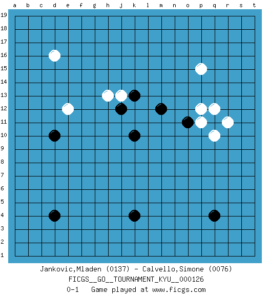 Last move : 0-1 2011 October 3 11:21:25 [Event "FICGS__GO__TOURNAMENT_KYU__000126"] [Site "FICGS"] [Date "2011.08.21"] [Round "1"] [Black "Jankovic,Mladen"] [White "Calvello,Simone"] [Result "0-1"] [Rating 1 "0137"] [Rating 2 "0076"] 1.q4 p15 2.k10 d16 3.d4 j13 4.d10 e12 5.q11 p11 6.o11 p12 7.m12 q10 8.k4 r11 9.j12 h13 10.k13 q12 0-1 This go game has been lost on time (started : 2011.08.21 13:56:19) Here are the names of the openings (joseki) played in the four corners : Corner q16 : p15 q11 Go-no-go (Wu~wu~) 5-5 Point. The 5-5 was experimented with briefly during the "New Fuseki" movement in Japan in the 1930s. The 5-5 point has not retained popularity because the 4-4 hoshi (star) point strikes a better balance between influence and territory. As one can see from the variations, though, the 5-5 is playable. Player White won this Go (weiqi, baduk) game. Follow this game move after move (download)Go is essentially a form of harmony. Go in the 21st century will have to be go of the 'harmony of the six points - the four quarters, the above and the below.' As in life we will need to view the whole rather than the part. Japanese go has focused too heavily on the local (joseki) rather than the whole for 300 years. The reason the Chinese and Koreans are overtaking the Japanese is that they are closer to achieve this whole-board view. (Go Seigen, 9p, 1994) Locking firmely the window serves nothing, only small thiefs pass through there, the big thiefs enter through the front door. (Luc-Olivier Leclerc)