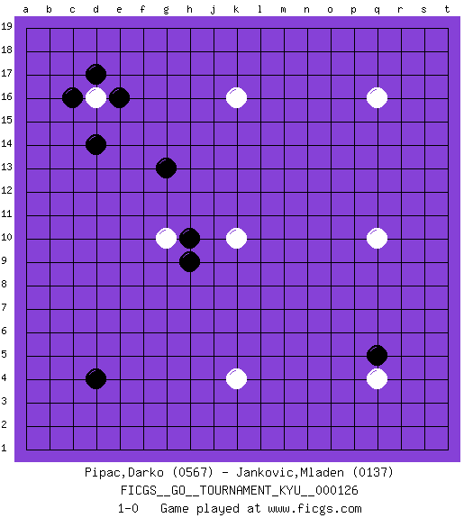 Last move : 1-0 2011 October 4 11:20:42 [Event "FICGS__GO__TOURNAMENT_KYU__000126"] [Site "FICGS"] [Date "2011.08.21"] [Round "1"] [Black "Pipac,Darko"] [White "Jankovic,Mladen"] [Result "1-0"] [Rating 1 "0567"] [Rating 2 "0137"] 1.d4 q16 2.d17 q4 3.q5 d16 4.c16 k10 5.e16 k16 6.g13 q10 7.h10 g10 8.h9 k4 9.d14 1-0 This go game has been lost on time (started : 2011.08.21 13:56:19) Here are the names of the openings (joseki) played in the four corners : Corner q4 : q4 q5 Hoshi (Hwajeom, Seongjeom, Xingwei`) 4-4 Point. The star or hoshi (4-4) point, emphasizing influence at the potential expense of territory. Corner d16 : d17 d16 Komoku (Somok, Xiao~mu`) 3-4 Point. The komoku (3-4) point is the traditional corner enclosure move.. Player Black won this Go (weiqi, baduk) game. Follow this game move after move (download)Don't disturb symmetry. (Anonymous) There are three kinds of lies: lies, damned lies and statistics. (Mark Twain)