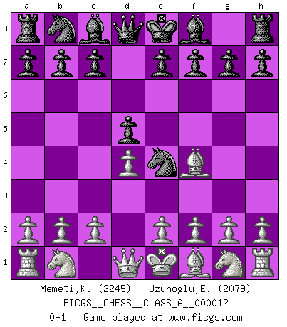 Last move : 0-1 2007 March 3 0:19:23 [Event "FICGS__CHESS__CLASS_A__000012"] [Site "FICGS"] [Date "2007.01.02"] [Round "1"] [White "Memeti,Kastriot"] [Black "Uzunoglu,Efe Kerem"] [Result "0-1"] [WhiteElo "2245"] [BlackElo "2079"] 1.d4 Nf6 2.Bg5 Ne4 3.Bf4 d5 0-1 This chess game has been lost on time (started : 2007.01.02 6:35:20) Comment by player 2 : Efe Kerem Uzunoglu : d4 Trompowsky attack (Ruth, Opovcensky Opening) Player Black won this chess game. Follow this game move after move (download)Excellence at Chess is one mark of a scheming mind. (Sir Arthur Conan Doyle) Wenn Du nicht kämpfst, um anderen etwas zu beweisen, sondern nur für Dich selbst, dann bist du fast unbesiegbar. (Garry Kasparov) Los finales de Peón son del Ajedrez lo que el cesped es del Golf. (Cecil Purdy) Je menace de comprendre la position. (Anonyme) You have to believe in yourself. (Sun Tzu)