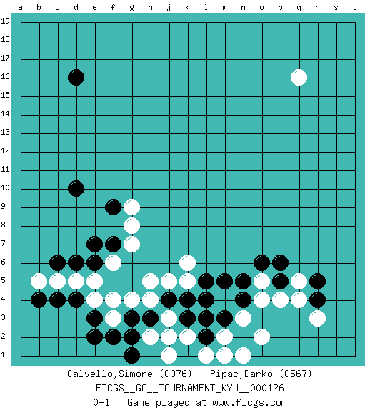 Last move : 0-1 2011 December 15 4:26:40 [Event "FICGS__GO__TOURNAMENT_KYU__000126"] [Site "FICGS"] [Date "2011.08.21"] [Round "1"] [Black "Calvello,Simone"] [White "Pipac,Darko"] [Result "0-1"] [Rating 1 "0076"] [Rating 2 "0567"] 1.p5 q16 2.d16 c5 3.d10 m4 4.m5 o4 5.n5 o5 6.o6 q4 7.n4 p4 8.p6 n3 9.m3 m2 10.l4 n1 11.l2 o2 12.m1 l1 13.k1 m1 14.d4 k2 15.k3 j1 16.l3 j3 17.h3 h2 18.j4 j2 19.g2 h4 20.g3 h5 21.c6 d5 22.d6 e5 23.c4 b5 24.b4 e4 25.e3 g4 26.g1 f3 27.f2 f4 28.e2 j5 29.k4 k5 30.l5 k6 31.e6 f6 32.f7 g7 33.e7 g8 34.f9 g9 35.r4 r3 36.r5 q5 0-1 This go game has been lost on time (started : 2011.08.21 13:56:19) Here are the names of the openings (joseki) played in the four corners : Corner q4 : p5 m4 Go-no-go (Wu~wu~) 5-5 Point. The 5-5 was experimented with briefly during the "New Fuseki" movement in Japan in the 1930s. The 5-5 point has not retained popularity because the 4-4 hoshi (star) point strikes a better balance between influence and territory. As one can see from the variations, though, the 5-5 is playable. Corner d4 : c5 d4 Mokuhazushi (Waemok, Wai`mu`) 5-3 Point. The mokuhazushi (5-3) point was popular in the Edo period in Japan (1600 - 1867). It emphasizes influence; territorially, it is inferior to the 3-4 point. Player White won this Go (weiqi, baduk) game. Follow this game move after move (download)Go is essentially a form of harmony. Go in the 21st century will have to be go of the 'harmony of the six points - the four quarters, the above and the below.' As in life we will need to view the whole rather than the part. Japanese go has focused too heavily on the local (joseki) rather than the whole for 300 years. The reason the Chinese and Koreans are overtaking the Japanese is that they are closer to achieve this whole-board view. (Go Seigen, 9p, 1994) When the going gets tactical, the computers get going. (Hyatt)