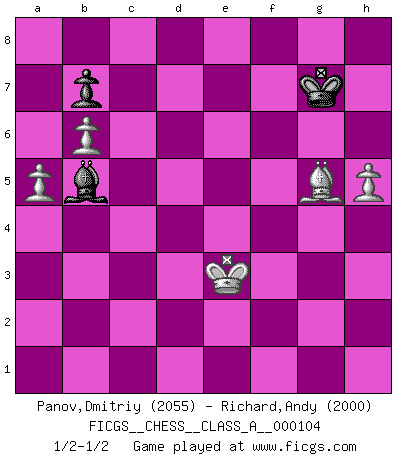 Last move : 1/2-1/2 2012 January 20 23:55:8 [Event "FICGS__CHESS__CLASS_A__000104"] [Site "FICGS"] [Date "2011.08.21"] [Round "1"] [White "Panov,Dmitriy"] [Black "Richard,Andy"] [Result "1/2-1/2"] [WhiteElo "2055"] [BlackElo "2000"] 1.e4 Nf6 2.e5 Nd5 3.d4 d6 4.Nf3 dxe5 5.Nxe5 c6 6.Be2 Bf5 7.O-O Nd7 8.c4 Nb4 9.Ng4 Nc2 10.Ne3 Nxe3 11.fxe3 Bg6 12.Nc3 e6 13.Kh1 Nf6 14.Bf3 e5 15.Bd2 Be7 16.Be1 O-O 17.Bg3 exd4 18.exd4 Bd6 19.Bh4 Re8 20.Re1 Be7 21.Bf2 Bd6 22.Rxe8+ Qxe8 23.d5 cxd5 24.Nxd5 Ne4 25.Bxe4 Qxe4 26.Nf6+ gxf6 27.Qxd6 Qxc4 28.Qxf6 Qe6 29.Qf4 Qe4 30.Qc7 Re8 31.Bxa7 Qd5 32.h3 Re2 33.Qc8+ Kg7 34.Qg4 Rd2 35.Be3 h5 36.Qf3 Qxf3 37.gxf3 Re2 38.Bd4+ f6 39.Rg1 Rd2 40.Bc3 Rf2 41.Rg3 h4 42.Rg4 Rxf3 43.Kg2 Re3 44.a3 Re4 45.Kf3 Rxg4 46.Kxg4 Bc2 47.Kxh4 Kg6 48.Kg4 Bf5+ 49.Kg3 Be6 50.a4 Bb3 51.a5 Kg5 52.h4+ Kf5 53.Bd4 Bc4 54.b4 Bb5 55.Kf3 Bc6+ 56.Ke3 Be8 57.Bc3 Ke6 58.Ke4 Bg6+ 59.Kd4 Kd6 60.Ke3 Ke6 61.b5 Kd6 62.Bd4 Be8 63.b6 Bb5 64.Bxf6 Ke6 65.Bd8 Kf7 66.h5 Kg7 67.Bg5 1/2-1/2 Alekhine's defense : Modern, Larsen variation Kingside Castling by player White (move 7) Kingside Castling by player Black (move 16) 10 pieces endgame at move 46 : White KBPPP , Black KBPPP WHITE : King + 1 Bishop 3 Pawns BLACK : King + 1 Bishop 3 Pawns 9 pieces endgame at move 47 : White KBPPP , Black KBPP WHITE : King + 1 Bishop 3 Pawns BLACK : King + 1 Bishop 2 Pawns 8 pieces endgame at move 64 : White KBPPP , Black KBP WHITE : King + 1 Bishop 3 Pawns BLACK : King + 1 Bishop 1 Pawn This chess game ended in a draw. Follow this game move after move (download)As one by one I mowed them down, my superiority soon became apparent. (Jose Capablanca) Ihnen, Herr Lasker, habe ich nur drei Worte zu sagen: Schach und matt. (Siegbert Tarrasch) El Ajedrez es el arte del análisis. (Mikhail Botvinnik) On n'a jamais que l'âge auquel on a commence à jouer aux échecs car après on cesse de vieillir. (Capablanca) The Internet is so big, so powerful and pointless that for some people it is a complete substitute for life. (Andrew Brown)