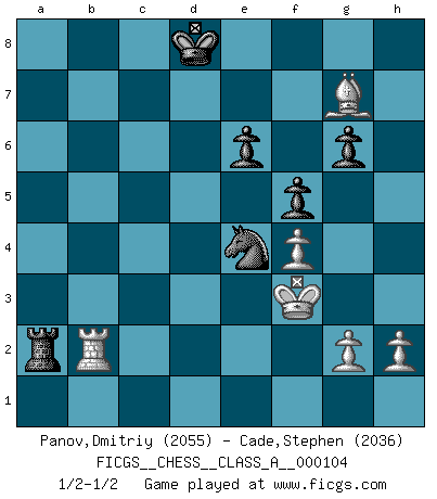 Last move : 1/2-1/2 2011 December 2 11:52:49 [Event "FICGS__CHESS__CLASS_A__000104"] [Site "FICGS"] [Date "2011.08.21"] [Round "1"] [White "Panov,Dmitriy"] [Black "Cade,Stephen"] [Result "1/2-1/2"] [WhiteElo "2055"] [BlackElo "2036"] 1.e4 c5 2.c3 Nf6 3.e5 Nd5 4.d4 cxd4 5.cxd4 d6 6.Nf3 e6 7.Bc4 Nc6 8.O-O Be7 9.Qe2 O-O 10.Nc3 Nxc3 11.bxc3 dxe5 12.dxe5 Qa5 13.Bd2 Rd8 14.Rfd1 Qc7 15.Bf4 b6 16.Bd3 Bb7 17.Nd2 Na5 18.Ne4 Rac8 19.Nd6 Bxd6 20.exd6 Qc6 21.f3 Qxc3 22.Rac1 Qd4+ 23.Be3 Qb4 24.Rxc8 Rxc8 25.Bg5 Qc5+ 26.Be3 Qe5 27.f4 Qf6 28.Bb5 Rd8 29.Qc2 Qg6 30.Qxg6 hxg6 31.d7 Bc6 32.Bxc6 Nxc6 33.Rc1 Ne7 34.Rc7 Kf8 35.Bc1 f5 36.Rxa7 Nd5 37.Rb7 Nf6 38.Rxb6 Rxd7 39.Kf2 Rc7 40.Bb2 Rc2+ 41.Kf3 Ne4 42.Rb8+ Ke7 43.Rb7+ Kd8 44.Bxg7 Rxa2 45.Rb2 1/2-1/2 Sicilian : Alapin's variation (2.c3) Kingside Castling by player White (move 8) Kingside Castling by player Black (move 9) This chess game ended in a draw. Follow this game move after move (download)Becoming successful at Chess allows you to discover your own personality. That's what I want for the kids I teach. (Saudin Robovic) Es hat in meinem Leben Zeiten gegeben, in denen das Schachspiel, wenn nicht zum Lebenszweck, so doch zu einem regelrechten Lebensersatz geworden ist. Man fühlt sich in solchen Zeiten nicht so, als besäße man eine göttliche Gabe, sondern eher so, als sei man von ihr besessen. (Garry Kasparov) Una compensación adecuada por un sacrificio es tener una combinación sólida que conduce a una posición ganadora; una compensación adecuada por una metida de pata es dejar a tu oponente arrebatar una derrota de las fauces de la victoria. (Bruce A. Moon) Un millionnaire : 'Monsieur Steinitz ! Vous ne participez aux tournois que pour l'argent, alors que moi je n'y viens que pour l'honneur.' Steinitz : 'Chacun joue pour ce qu'il n'a pas'... Everything in life is luck. (Donald Trump)