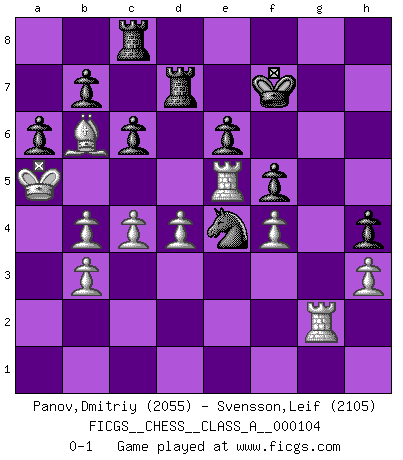 Last move : 0-1 2013 January 13 12:17:12 [Event "FICGS__CHESS__CLASS_A__000104"] [Site "FICGS"] [Date "2011.08.21"] [Round "1"] [White "Panov,Dmitriy"] [Black "Svensson,Leif"] [Result "0-1"] [WhiteElo "2055"] [BlackElo "2105"] 1.e4 Nf6 2.e5 Nd5 3.d4 d6 4.Nf3 dxe5 5.Nxe5 c6 6.Be2 Bf5 7.O-O Nd7 8.Bd3 Bxd3 9.Nxd3 e6 10.c4 Ne7 11.Nc3 Nf6 12.Qb3 Qb6 13.Bf4 Qxb3 14.axb3 a6 15.Nc5 Ng6 16.Bc7 Rc8 17.Ba5 Rb8 18.f3 h5 19.Rfe1 h4 20.Red1 Rh5 21.Bb6 Be7 22.N5e4 Kd7 23.Nc5+ Ke8 24.N5e4 Nxe4 25.Nxe4 Bd8 26.Nd6+ Kd7 27.Bxd8 Kxd6 28.Ba5 Ne7 29.Re1 Nf5 30.Rad1 R5h8 31.Kf2 f6 32.Bb6 Rbg8 33.Ke2 g5 34.Kd3 Ng7 35.Kc3 Nh5 36.Rd2 Kd7 37.Rf1 g4 38.f4 f5 39.Re2 Nf6 40.Re5 Re8 41.Kb4 Ke7 42.Ka5 Kf7 43.Bc5 Rd8 44.Bb6 Rd7 45.Rd1 Rc8 46.Bc5 Ne4 47.Bb6 Kf6 48.Re1 Rh7 49.h3 gxh3 50.gxh3 Rd7 51.Rg1 Rd6 52.Rg2 Kf7 53.b4 Re8 54.b3 Rd7 55.Rg1 Rf8 56.Rg2 Rc8 0-1 Alekhine's defense : Modern, Larsen variation Kingside Castling by player White (move 7) Player Black won this chess game. Follow this game move after move (download)Chess is the art which expresses the science of logic. (Mikhail Botvinnik) Ich glaube nicht an Psychologie, ich glaube an gute Züge. (Robert James Fischer) A través de las casillas del tablero, los Indios explican el movimiento del tiempo y la edad, las influencias mas altas que controlan el mundo y los lazos que vinculan al Ajedrez con el alma humana. (Al-Masudi) Aucun coup ne doit être joué sans but. (Pedro Damiano) An expert is a man who has made all the mistakes which can be made in a very narrow field. (Niels Bohr)