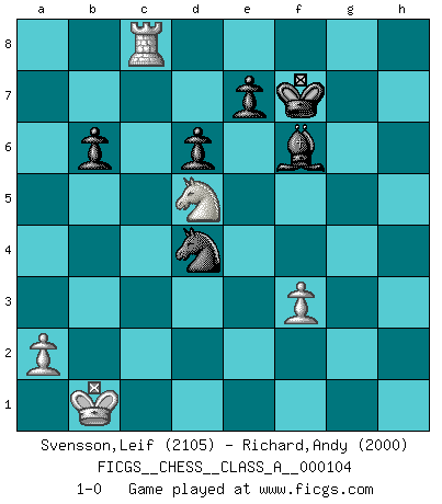 Last move : 1-0 2012 April 19 23:45:46 [Event "FICGS__CHESS__CLASS_A__000104"] [Site "FICGS"] [Date "2011.08.21"] [Round "1"] [White "Svensson,Leif"] [Black "Richard,Andy"] [Result "1-0"] [WhiteElo "2105"] [BlackElo "2000"] 1.e4 Nf6 2.e5 Nd5 3.d4 d6 4.Bc4 Nb6 5.Bb3 Bf5 6.Qf3 Qc8 7.exd6 cxd6 8.Ne2 Nc6 9.Nbc3 g6 10.Be3 Bg7 11.g4 Be6 12.Bxe6 Qxe6 13.O-O-O Qc4 14.Kb1 h5 15.gxh5 Rxh5 16.h4 Rc8 17.b3 Qb4 18.Ne4 Qa5 19.Bd2 Qd5 20.Bc1 Rf5 21.Qg4 Qe6 22.Rhe1 Qd7 23.Nf4 Ra5 24.Qg3 Kf8 25.h5 Qf5 26.hxg6 Nxd4 27.gxf7 Kxf7 28.Bb2 Rxc2 29.Bxd4 Bxd4 30.Kxc2 Be5 31.Kb1 Bxf4 32.Qd3 Re5 33.f3 Nd5 34.Re2 Nc7 35.Qc4+ Ne6 36.Qc2 Rd5 37.Rxd5 Qxd5 38.Nf2 Be5 39.Qh7+ Bg7 40.Qe4 Qe5 41.Qxe5 Bxe5 42.Nd3 Bf6 43.Rc2 a5 44.Rc8 b6 45.b4 axb4 46.Nxb4 Nd4 47.Nd5 1-0 Alekhine's defense : Balogh variation Queenside Castling by player White (move 13) Player White won this chess game. Follow this game move after move (download)My style is somewhere between that of Tal and Petrosian. (Reshevsky) Ich hatte Zahnschmerzen im ersten Spiel. In der zweiten Partie tat mir der Kopf weh. In der dritten war es eine Rheuma-Attacke und während der vierten fühlte ich mich nicht gut. Und in der fünften? Nun, man muss doch nicht jedes Spiel gewinnen, oder? (Savielly Grigorievitsch Tartakower) Desconfianza es la característica mas necesaria de un jugador de Ajedrez. (Siegbert Tarrasch) Nous vivons dans un monde échiquéen : chaque jour qui passe est un défi à relever. (Philosophe Sasha) Difficult things take a long time, impossible things a little longer. (Author unknown)