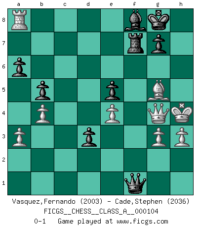 Last move : 0-1 2012 May 2 17:10:39 [Event "FICGS__CHESS__CLASS_A__000104"] [Site "FICGS"] [Date "2011.08.21"] [Round "1"] [White "Vasquez,Fernando"] [Black "Cade,Stephen"] [Result "0-1"] [WhiteElo "2003"] [BlackElo "2036"] 1.e4 c5 2.d4 cxd4 3.c3 dxc3 4.Nxc3 Nc6 5.Nf3 d6 6.Bc4 a6 7.O-O Nf6 8.h3 e6 9.Qe2 Be7 10.Rd1 Qc7 11.Bf4 Ne5 12.Bd3 Bd7 13.Rac1 Qb8 14.Bg5 h6 15.Bf4 Nxd3 16.Qxd3 e5 17.Bd2 O-O 18.Nh2 Be6 19.Nf1 b5 20.Ne3 Qb7 21.Ncd5 Rfc8 22.Ba5 Nxd5 23.Nxd5 Bh4 24.Rc7 Rxc7 25.Nxc7 Rf8 26.b3 Be7 27.Qe3 Rc8 28.Nxe6 fxe6 29.Bb4 Rc6 30.Qf3 Qc7 31.Qg4 Qd7 32.Rd3 Rc1+ 33.Kh2 Rc2 34.Bd2 Bf8 35.a3 Ra2 36.b4 Qf7 37.Bxh6 Rxf2 38.Bg5 d5 39.Rc3 d4 40.Rc8 Rf1 41.Ra8 Qf2 42.Qxe6+ Kh7 43.Qg4 Qg1+ 44.Kg3 Rf2 45.Kh4 d3 46.Qh5+ Kg8 47.Qg4 Qf1 48.g3 Rf7 0-1 This chess game has been lost on time (started : 2011.08.21 21:44:45) Sicilian : Smith-Morra gambit Kingside Castling by player White (move 7) Kingside Castling by player Black (move 17) Player Black won this chess game. Follow this game move after move (download)Bobby is the most misunderstood, misquoted celebrity walking the face of this earth. (Yasser Seirawan) Sicherlich können nur Meister einen Stil haben. Daß ein nicht-Meister auch nur ein einziges Mal in seinem Leben eine Partie folgerecht durchführte, habe ich niemals bemerkt. (Emanuel Lasker) El muchacho (en ese entonces un niño de 12 años llamado Anatoly Karpov) no tiene ni idea de lo que es el Ajedrez y no hay futuro en absoluto para el en esta profesión. (Mikhail Botvinnik) La vie et les Echecs sont tous les deux une lutte constante. (Lasker) There will be no order, only chaos. (Sol Robeson in Pi by Darren Aronofsky)