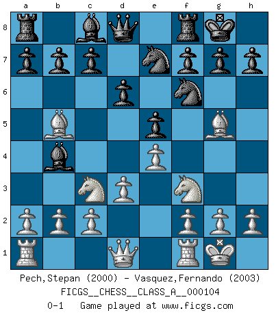 Last move : 0-1 2011 November 20 13:18:33 [Event "FICGS__CHESS__CLASS_A__000104"] [Site "FICGS"] [Date "2011.08.21"] [Round "1"] [White "Pech,Stepan"] [Black "Vasquez,Fernando"] [Result "0-1"] [WhiteElo "2000"] [BlackElo "2003"] 1.e4 e5 2.Nf3 Nf6 3.Nc3 Nc6 4.Bb5 Bb4 5.O-O O-O 6.d3 d6 7.Bg5 Ne7 0-1 This chess game has been lost on time (started : 2011.08.21 21:44:45) Petrov Three knights game Kingside Castling by player White (move 5) Kingside Castling by player Black (move 5) Player Black won this chess game. Follow this game move after move (download)Don't even mention losing to me. I can't stand to think of it. (Bobby Fischer) Es ist peinlich, dass ich nie Weltmeister wurde. Es wäre leicht, Leonid Breschnjew als Ursache vorzuschieben, dessen Apparat den Vorzeigekommunisten Anatoli Karpow in allem unterstützte. Aber Garri Kasparow zum Beispiel, der ebenfalls von den Sowjets unerwünscht war, hat trotz der Widerstände den WM-Titel erobert. (Viktor Kortschnoi) El Ajedrez es imaginación. (David Bronstein) Le profane ne songe pas à la somme de jouissance dont il se prive, qui méconnaît ce jeu aux ressources aussi variées que passionnantes. (Jean-Marie Jeanton-Lamarche) We need strong personalities and only one world champion to attract sponsors. (Anatoly Karpov)