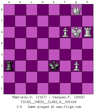 Last move : 1-0 2012 May 2 17:34:56 [Event "FICGS__CHESS__CLASS_A__000104"] [Site "FICGS"] [Date "2011.08.21"] [Round "1"] [White "Mamrukov,Dmitri"] [Black "Vasquez,Fernando"] [Result "1-0"] [WhiteElo "2167"] [BlackElo "2003"] 1.d4 d5 2.c4 dxc4 3.e4 e5 4.Nf3 exd4 5.Bxc4 Nc6 6.O-O Be6 7.Bb5 Bc5 8.b4 Bb6 9.a4 a5 10.bxa5 Rxa5 11.Nbd2 Ra8 12.Nb3 Bxb3 13.Bxc6+ bxc6 14.Qxb3 Nf6 15.a5 Ba7 16.Ba3 c5 17.e5 Nd5 18.Bxc5 Bxc5 19.Qb5+ Qd7 20.Qxc5 Nf4 21.Nxd4 Qxd4 22.Qc6+ Ke7 23.Rad1 Nd3 24.Qxc7+ Ke6 25.Qc6+ Ke7 26.Qb7+ Ke6 27.Qb3+ Qd5 28.Qxd5+ Kxd5 29.Rxd3+ Kxe5 30.Re1+ Kf5 31.Rd5+ Kg6 32.Rd6+ Kf5 33.a6 Ra7 34.Rb1 Ke5 35.Rbd1 Rb8 36.R1d5+ Ke4 37.g3 f6 38.Kg2 Rb2 39.Ra5 h5 40.h4 f5 41.Re6+ Kd3 42.Rxf5 Ra2 43.Rxh5 Rf7 44.Kh3 Ra7 45.f4 R7xa6 46.Rxa6 Rxa6 47.Rh7 g6 48.Rh6 Ke4 49.h5 Kf3 50.hxg6 Ra1 51.Kh4 Ra6 52.f5 Ke4 53.Kg5 Ra7 54.f6 Ke3 55.g7 Ra5+ 56.Kg6 Ra3 57.g8Q 1-0 QGA : 3.e4 Kingside Castling by player White (move 6) 10 pieces endgame at move 45 : White KRRPPP , Black KRRP WHITE : King + 2 Rooks 3 Pawns BLACK : King + 2 Rooks 1 Pawn 9 pieces endgame at move 46 : White KRRPPP , Black KRP WHITE : King + 2 Rooks 3 Pawns BLACK : King + 1 Rook 1 Pawn 8 pieces endgame at move 46 : White KRPPP , Black KRP WHITE : King + 1 Rook 3 Pawns BLACK : King + 1 Rook 1 Pawn 7 pieces endgame at move 50 : White KRPPP , Black KR WHITE : King + 1 Rook 3 Pawns BLACK : King + 1 Rook Promotion Queen by player White (move 57) Player White won this chess game. Follow this game move after move (download)Chess is the gymnasium of the mind. (Blaise Pascal) Im Schach gibt es keinen Platz für Galanterie. (Irving Chernev) Un buen jugador siempre tiene buena suerte. (José Raúl Capablanca) L'ordinateur a tué l'originalité. Il n'y a plus guère d'aventures sur l'échiquier. (Jacob Murray) Secret operations are essential in war; upon them the army relies to make its every move. (Sun Tzu)