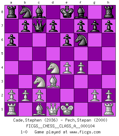 Last move : 1-0 2011 November 20 13:18:33 [Event "FICGS__CHESS__CLASS_A__000104"] [Site "FICGS"] [Date "2011.08.21"] [Round "1"] [White "Cade,Stephen"] [Black "Pech,Stepan"] [Result "1-0"] [WhiteElo "2036"] [BlackElo "2000"] 1.e4 c5 2.Nf3 e6 3.d4 cxd4 4.Nxd4 a6 5.Nc3 Qc7 6.Bd3 Nf6 7.f4 1-0 This chess game has been lost on time (started : 2011.08.21 21:44:45) Sicilian : Kan, 5.Nc3 Player White won this chess game. Follow this game move after move (download)A sacrifice is best refuted by accepting it. (Wilhelm Steinitz) Modernes Schach sorgt sich zuviel um Dinge wie Bauernstruktur usw. Vergessen Sie das, Schachmatt beendet das Spiel! (Nigel Short) Los errores estan ahí, esperando a que se cometan. (Savielly Tartakower) Le temps de noter son nom sur la feuille de partie, j'étais déjà en zeitnot ! D'un modeste amateur apparié lors de la première ronde d'un open contre le grand-maître Azmaïparashvili. Man is still the most extraordinary computer of all. (John F. Kennedy)