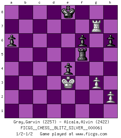 Last move : 1/2-1/2 2011 August 22 20:0:32 [Event "FICGS__CHESS__BLITZ_SILVER__000061"] [Site "FICGS"] [Date "2011.08.22"] [Round "1"] [White "Gray,Garvin"] [Black "Alcala,Alvin"] [Result "1/2-1/2"] [WhiteElo "2257"] [BlackElo "2422"] 1.d4 Nf6 2.Nf3 d5 3.c4 c6 4.Nc3 e6 5.e3 Nbd7 6.Qc2 Bd6 7.Bd3 O-O 8.O-O dxc4 9.Bxc4 c5 10.Rd1 a6 11.a4 Qc7 12.Ne4 Nxe4 13.Qxe4 Nf6 14.Qh4 cxd4 15.Bd3 h6 16.e4 Nd7 17.Nxd4 Ne5 18.Be2 Bd7 19.g3 Qb6 20.a5 Qb4 21.b3 Qc3 22.Ra2 Rac8 23.Bb2 Qc7 24.Kg2 Rfd8 25.Ba1 Bb4 26.f4 Nc6 27.f5 Be7 28.Qg4 e5 29.Nxc6 Bxc6 30.Rxd8+ Rxd8 31.Bc4 Bb5 32.Qe2 Bxc4 33.Qxc4 Qxc4 34.bxc4 f6 35.Bc3 Rd3 36.Be1 Rb3 37.Rd2 Kf7 38.Bf2 Ke8 39.Bb6 Rb4 40.Rc2 Ra4 41.Kh3 Bb4 42.c5 Bxa5 43.Bxa5 Rxa5 44.Kg4 Ra4 45.Rb2 Rxe4+ 46.Kf3 Rc4 47.Rxb7 e4+ 48.Ke3 Rxc5 49.Rxg7 Rxf5 1/2-1/2 Queen's pawn game Kingside Castling by player Black (move 7) Kingside Castling by player White (move 8) 10 pieces endgame at move 49 : White KRPP , Black KRPPPP WHITE : King + 1 Rook 2 Pawns BLACK : King + 1 Rook 4 Pawns This chess game ended in a draw. Follow this game move after move (download)Only sissies Castle. (Rob Sillars) Die Neutralität betrachte ich als eine schwere Krankheit. (Viktor Kortschnoi) Aquel que teme a un Peón de Reina aislado, debería de retirarse del Ajedrez. (Siegbert Tarrasch) Des combinaisons [dans le jeu d'échecs] pareilles à des mélodies. Je crois entendre pour ainsi dire la musique des coups... (Vladimir Nabokov) Luck never gives; it only lends. (Swedish proverb)