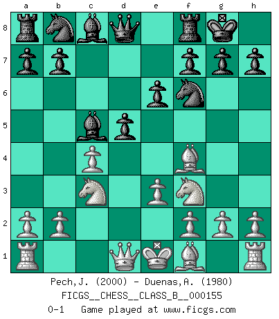 Last move : 0-1 2011 December 1 22:10:54 [Event "FICGS__CHESS__CLASS_B__000155"] [Site "FICGS"] [Date "2011.08.24"] [Round "1"] [White "Pech,Jaroslav senior"] [Black "Duenas,Alexis"] [Result "0-1"] [WhiteElo "2000"] [BlackElo "1980"] 1.d4 d5 2.c4 e6 3.Nc3 Nf6 4.Nf3 Be7 5.Bf4 O-O 6.e3 c5 7.dxc5 Bxc5 0-1 QGD : Classical variation (5.Bf4) Kingside Castling by player Black (move 5) Player Black won this chess game. Follow this game move after move (download)If Chess is a science, it's a most inexact one. If Chess is an art, it is too exacting to be seen as one. If Chess is a sport, it's too esoteric. If Chess is a game, it's too demanding to be just a game. If Chess is a mistress, she's a demanding one. If Chess is a passion, it's a rewarding one. If Chess is life, it's a sad one. (Unknown) Du musst Deinen Gegner in einen tiefen dunklen Wald führen wo 2+2=5 ist und wo der Weg, der wieder hinausführt, nur breit genug für einen ist. (Mikhail Nekhemyevich Tal) Tu puedes aprender mucho mas de una partida que pierdas que de una partida ganada. Tendras que perder cientos de partidas antes de llegar a ser un buen jugador. (Jose Raul Capablanca) Assurément je connaissais par expérience le mystérieux attrait de ce jeu royal, le seul entre tous les jeux inventés par les hommes qui échappe souverainement à la tyrannie du hasard, le seul où l'on ne doive sa victoire qu'à son intelligence ou plutôt à une certaine forme d'intelligence. Mais n'est-ce pas déjà le limiter injurieusement que d'appeler les échecs un jeu ? N'est-ce pas une science, un art ou quelque chose qui, comme le cercueil de Mahomet entre ciel et terre, est suspendu entre l'un et l'autre, et qui réunit un nombre incroyable de contraires ? [...] C'est une pensée qui ne mène à rien, une mathématique qui n'établit rien, un art qui ne laisse pas d'uvre, une architecture sans matière; et il l'a prouvé néanmoins qu'il était plus durable, à sa manière, que les livres ou que tout autre monument, ce jeu unique qui appartient à tous les peuples et à tous les temps, et dont personne ne sait quel dieu en fit don à la terre pour tuer l'ennui, pour aiguiser l'esprit et stimuler l'âme. Où commence-t-il, où finit-il ? (Stefan Zweig) A journey of a thousand sites begins with a single click. (Author unknown)