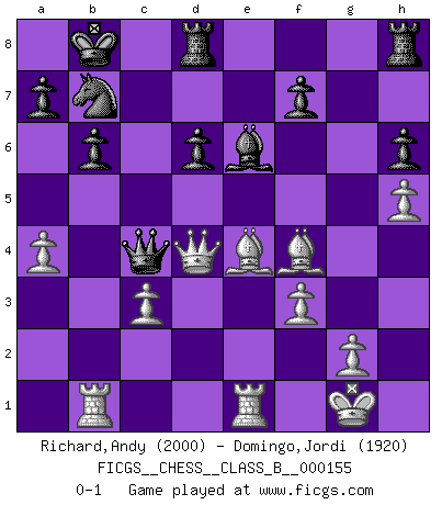 Last move : 0-1 2012 April 28 12:19:12 [Event "FICGS__CHESS__CLASS_B__000155"] [Site "FICGS"] [Date "2011.08.24"] [Round "1"] [White "Richard,Andy"] [Black "Domingo,Jordi"] [Result "0-1"] [WhiteElo "2000"] [BlackElo "1920"] 1.d4 h6 2.c4 g5 3.e4 Bg7 4.h4 g4 5.Nc3 c5 6.dxc5 Bxc3+ 7.bxc3 Qa5 8.Ne2 Nf6 9.Be3 Nxe4 10.Qd3 Nf6 11.Nf4 Na6 12.Nd5 Nxc5 13.Nxf6+ exf6 14.Qd4 d6 15.Be2 Be6 16.O-O O-O-O 17.Bxg4 f5 18.Be2 Ne4 19.Rfc1 b6 20.f3 Nc5 21.Bf4 Kb7 22.Rcb1 Qa4 23.Rb2 Ka8 24.h5 Nb7 25.Rd1 Qc6 26.Rb5 Rc8 27.a4 Na5 28.Bd3 Nb7 29.Bxf5 Qxc4 30.Re1 Rce8 31.Be4 Kb8 32.R5b1 Rd8 0-1 Queen's pawn Kingside Castling by player White (move 16) Queenside Castling by player Black (move 16) Player Black won this chess game. Follow this game move after move (download)It is no time to be playing Chess when the house is on fire. (Italian Proverb) Schach ist ein schwarz-weisser Dschungel. (Garry Kasparov) ¿Cual es el objetivo de jugar una apertura de gambito?... Para adquirir una reputación de ser un jugador apuesto a costo de perder el juego. (Siegbert Tarrasch) Les Echecs, c'est l'art de la guerre sans les charniers, c'est la résurrection des morts tombés au champ d'honneur, l'espoir perpétuel, la suprématie de l'intelligence sur la force, la culture de l'esprit. (F. Szpiner) If you ain't just a little scared when you enter a casino, you are either very rich or you haven't studied the games enough. (Pappy)