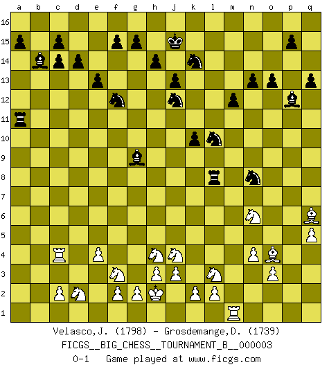 Last move : 0-1 2012 February 17 7:45:34 [Event "FICGS__BIG_CHESS__TOURNAMENT_B__000003"] [Site "FICGS"] [Date "2011.08.24"] [Round "1"] [White "Velasco,Jose Maria"] [Black "Grosdemange,David"] [Result "0-1"] [WhiteElo "1798"] [BlackElo "1739"] 1.j2-h4 j15-h13 2.h1-o7 m15-m13 3.m2-m4 k16-l14 4.n2-n4 p16-o14 5.e2-e4 b16-c14 6.d2-d4 g16-f14 7.l1-o4 h16-l13 8.k1-l3 e15-e13 9.c1-k8 l13-b4 10.b1-d2 b4-d4 11.g1-f3 d4-b2 12.f1-d3 b2-b11 13.l3-j4 b11-e14 14.a1-d1 f16-c13 15.o7-c7 d15-d14 16.c7-l15 h13-k14 17.l15-q10 l16-p12 18.o1-f9 n15-n14 19.k8-o12 e14-p4 20.p1-q3 p4-p2 21.q3-p5 p2-p4 22.o12-k8 p4-e14 23.d3-b5 l14-j13 24.k8-g11 o16-m14 25.q10-p9 e14-k9 26.p9-p6 c16-e14 27.g11-j9 q15-q13 28.d2-b3 j16-j15 29.j9-m12 e16-l16 30.j4-l3 l16-l12 31.o4-j9 m16-l16 32.f9-g8 l12-l6 33.p6-n8 k9-l8 34.n8-l8 l16-l8 35.g8-k5 l6-b6 36.k5-f9 a16-l16 37.f9-c6 m14-l13 38.j9-d4 b6-b12 39.m12-g7 b12-o12 40.o2-o3 c13-g9 41.g7-n13 o12-n12 42.d1-b1 m13-m12 43.n13-q10 g9-b14 44.m4-m5 l13-g9 45.b5-d3 e14-k9 46.b3-d2 q16-m16 47.c6-g10 n12-n10 48.g10-c14 b15-c14 49.q10-m6 n10-a10 50.d3-c4 k9-j10 51.c4-j10 a10-j10 52.m6-j9 n14-n13 53.b1-b9 j13-h11 54.j9-g11 f14-h13 55.g11-h12 j14-j13 56.h12-n7 k14-j12 57.e1-b1 k15-k13 58.d4-e3 o14-n12 59.h2-j4 o15-o13 60.j1-h2 j10-a10 61.b9-c9 a10-a2 62.m5-m6 h13-f12 63.m6-m7 l8-q8 64.n7-o6 q8-q9 65.c9-c6 l16-l10 66.m7-m8 m16-l16 67.c6-c4 l16-l11 68.e3-l9 k13-k12 69.m1-m5 k12-k11 70.q2-q4 k11-k10 71.l9-k8 l10-l8 72.k8-o4 n12-m10 73.o6-p7 l11-m11 74.q4-q5 m10-n8 75.p7-n9 h11-j9 76.p5-n6 j9-l10 77.n9-q6 a2-a11 78.q1-m1 h15-k14 79.m8-m9 q9-m9 80.m5-m9 m11-m9 81.m1-m9 p12-m9 82.b1-m1 m9-p12 0-1 This big chess game has been lost on time (started : 2011.08.24 14:53:13) Follow this game move after move (download)A player surprised is half beaten. (Proverb) Jeder Schachmeister war einmal ein Anfänger. (Irving Chernev) Una de estas pequeñas movidas modestas pudieran ser mas molestas a tu oponente que la amenaza mas grande. (Siegbert Tarrasch) L'action d'une oeuvre littéraire se déroule sur un champ de bataille. Les masques et les types du drame moderne correspondent aux pièces du jeu d'échecs. L'intrigue correspond aux coups et aux gambits, c'est à dire aux techniques du jeu telles qu'utilisées et interprétées par les joueurs. Les tactiques et les péripéties [mouvements] correspondent aux coups exécutés par l'adversaire. (Viktor Shklovsky) All maxims have their antagonist maxims; proverbs should be sold in pairs, a single one being but a half truth. (William Mathews)