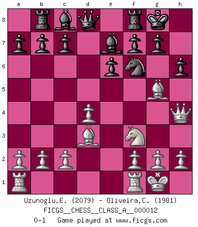 Last move : 0-1 2007 April 19 17:48:27 [Event "FICGS__CHESS__CLASS_A__000012"] [Site "FICGS"] [Date "2007.01.02"] [Round "1"] [White "Uzunoglu,Efe Kerem"] [Black "Oliveira,Carlos"] [Result "0-1"] [WhiteElo "2079"] [BlackElo "1981"] 1.d4 d5 2.Nf3 Nf6 3.e3 e6 4.Bd3 Bd6 5.Nbd2 O-O 6.Qe2 Nbd7 7.e4 dxe4 8.Nxe4 Nxe4 9.Qxe4 Nf6 10.Qh4 Be7 11.O-O Rb8 12.Bg5 h6 0-1 This chess game has been lost on time (started : 2007.01.02 6:35:20) Queen's pawn game Kingside Castling by player Black (move 5) Kingside Castling by player White (move 11) Player Black won this chess game. Follow this game move after move (download)There just isn't enough televised Chess. (David Letterman) Eine Person mit durchschnittlichem IQ kann etwa eine ELO von 2000 erreichen. (Jonathan Levitt) Un sacrificio se refuta mucho mejor al aceptarlo. (Wilhelm Steinitz) Les écrivains ont utilisé les échecs pour analyser les côtés extrêmes de la nature humaine. Dans ce cadre, les échecs offrent un champ d'expérimentation idéal. Mais on pourrait faire la même chose avec la peinture. Et là, en vous référant à Van Gogh, vous ne tirerez pas de conclusion définitive sur les peintres. (Gary Kasparov) Horse racing is animated roulette. (Roger Kahn)
