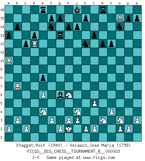 Last move : 1-0 2011 November 20 14:0:55 [Event "FICGS__BIG_CHESS__TOURNAMENT_B__000003"] [Site "FICGS"] [Date "2011.08.24"] [Round "1"] [White "Staggat,Rolf"] [Black "Velasco,Jose Maria"] [Result "1-0"] [WhiteElo "1940"] [BlackElo "1798"] 1.j2-k4 p16-o14 2.b1-c3 j15-h13 3.p1-o3 h16-o10 4.h2-g4 e15-e13 5.e2-e4 f16-b12 6.d2-d4 o10-j10 7.h1-l4 n15-n13 8.g1-j2 o16-f8 9.k1-l3 d15-d13 10.n2-n4 k16-l14 11.m2-m4 m15-m13 12.l1-p5 l16-p12 13.f1-b5 c16-h11 14.b5-h11 j10-h11 15.l3-j4 h11-j12 16.f2-f3 b16-c14 17.c1-h6 f8-h6 18.g4-h6 j12-c6 19.h6-g4 c6-d6 20.e4-e5 d6-d4 21.a1-d1 d4-b4 22.d1-b1 m13-m12 23.j1-h2 m16-m13 24.l4-f9 g16-f14 25.o1-g8 m13-l13 26.e1-e4 b4-h10 27.m1-d1 a16-d16 28.p5-n7 h13-f12 29.n7-l5 p12-o13 30.e4-e2 o13-g6 31.g8-f7 g6-h7 32.f9-p9 l13-l5 33.m4-l5 h7-p14 34.q1-m1 b12-c13 35.d1-d9 q16-m16 36.c3-e4 h10-e7 37.e5-e6 e13-e12 38.m1-m7 e7-a7 39.d9-a9 a7-b6 40.e2-e3 c13-e11 41.j2-g3 f12-e14 42.p9-e9 b6-e9 43.a9-e9 e11-d10 44.e9-e10 d10-f12 45.b1-d1 e14-d12 46.e10-b10 d16-b16 47.e3-b3 b15-b14 48.b3-c3 c14-a13 49.d1-d12 f12-e13 50.d12-d10 a13-c12 51.b10-a10 c12-d10 52.a10-d10 c15-c13 53.b2-b3 h15-g13 54.q2-q3 e12-e11 55.d10-d9 l14-k12 56.j4-h6 e11-e10 57.d9-d10 e13-d12 58.k4-m3 g13-f11 59.d10-a10 a15-a13 60.m7-k7 l15-l13 61.f7-g8 f11-g9 62.h6-f7 e10-e9 63.c3-d3 e16-e13 64.g4-h6 b16-e16 65.g3-j4 g9-j8 66.h6-j8 p14-j8 67.k7-n7 n13-n12 68.f7-h6 j8-g6 69.g8-o15 e9-e8 70.n7-g7 e13-g13 71.g7-b7 c13-c12 72.d3-d12 1-0 Follow this game move after move (download)First-class players lose to second class players because second-class players sometimes play a first-class game. (Tarrasch) Es ist nicht das erste mal, dass sich die FIDE dem Arabischen Geld gebeugt hat (über die FIDE WM 2004 in Lybien). (Larry Evans) Por esta medida (el intervalo entre Fischer y sus contemporaneos), yo le considero el mas grande campeón mundial. (Garry Kasparov) RxDa4 pat (...) Wisdom doesn't necessarily come with age. Sometimes age just shows up all by itself. (Tom Wilson)