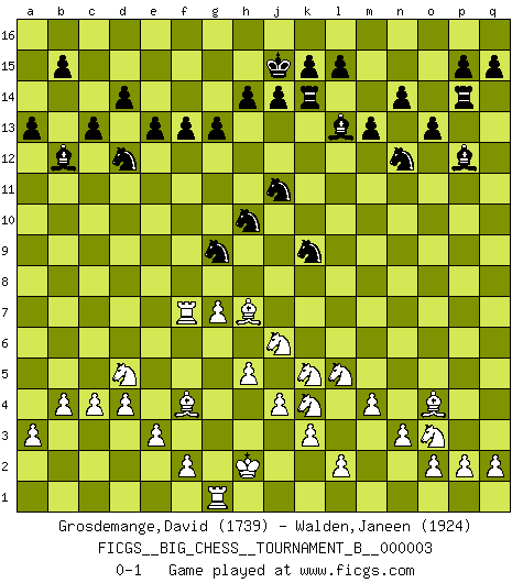 Last move : 0-1 2011 November 28 2:12:32 [Event "FICGS__BIG_CHESS__TOURNAMENT_B__000003"] [Site "FICGS"] [Date "2011.08.24"] [Round "1"] [White "Grosdemange,David"] [Black "Walden,Janeen"] [Result "0-1"] [WhiteElo "1739"] [BlackElo "1924"] 1.j2-k4 h15-g13 2.p1-o3 j15-k13 3.k1-l3 p16-o14 4.b1-c3 m15-m13 5.g1-f3 l16-p12 6.m2-m4 n15-n14 7.f3-h4 o16-j11 8.d2-d4 h16-l13 9.c1-f4 g16-j15 10.e2-e3 k16-h15 11.f1-d3 e15-e13 12.l1-o4 b16-c14 13.n2-n3 f16-b12 14.h2-j4 d15-d14 15.j1-h2 c16-h11 16.h1-l4 m16-m14 17.l4-l13 j11-l13 18.o1-h7 e16-e14 19.g2-g4 a15-a13 20.h4-j6 c14-d12 21.g4-g5 e14-f14 22.g5-g6 a16-e16 23.g6-g7 h15-j13 24.m1-g1 j15-h13 25.c3-d5 c15-c13 26.a2-a3 o14-n12 27.g1-g5 m14-l14 28.e1-g1 o15-o13 29.c2-c4 q16-o16 30.g5-f5 e16-e14 31.b2-b4 h13-j11 32.g1-g5 j16-j15 33.f5-f14 e14-f14 34.g5-f5 f14-f5 35.d3-f5 k13-l11 36.a1-g1 f15-f13 37.h3-h4 o16-o14 38.j4-l5 o14-p14 39.g1-g6 l14-k14 40.k2-k3 g13-f11 41.q1-g1 g15-g13 42.h4-h5 f11-g9 43.h7-g8 h11-k9 44.g6-f6 g9-e8 45.f6-f9 e8-d10 46.f9-f7 j13-g12 47.f5-k9 l11-k9 48.j3-j4 g12-h10 49.g8-h7 d10-f11 50.l3-k5 f11-g9 0-1 This big chess game has been lost on time (started : 2011.08.24 14:53:13) Follow this game move after move (download)A Chess game is divided into three stages: the first, when you hope you have the advantage, the second when you believe you have an advantage, and the third... when you know you're going to lose ! (Savielly Tartakower) Wenn du gegen Bobby spielst, ist es keine Frage von gewinnen oder verlieren. Es ist eine Frage des Überlebens. (Boris Vassilievich Spassky) Yo adoro todas la posiciones. Denme una partida posicional difícil, y la jugaré. Pero posiciones totalmente ganadas, no las tolero. (Hein Donner) Karpov est une pièce de musée. (Garry Kasparov) The real voyage of discovery consists not in seeking new lands but in seeing with new eyes. (Marcel Proust)