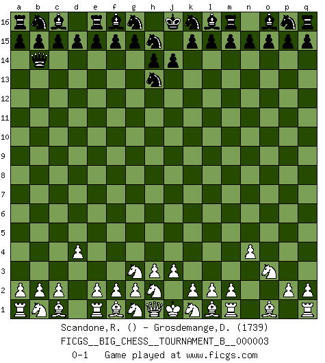 Last move : 0-1 2011 October 2 23:22:2 [Event "FICGS__BIG_CHESS__TOURNAMENT_B__000003"] [Site "FICGS"] [Date "2011.08.24"] [Round "1"] [White "Scandone,Raffaele"] [Black "Grosdemange,David"] [Result "0-1"] [WhiteElo ""] [BlackElo "1739"] 1.n2-n4 j15-h13 2.d2-d4 h16-o10 3.j2-g3 o10-o2 4.p1-o3 o2-b14 0-1 This big chess game has been lost on time (started : 2011.08.24 14:53:13) Follow this game move after move (download)A good player is always lucky. (Jose Raul Capablanca) Wenn Du absolut nicht mehr weißt, was Du tun sollst, dann ist es Zeit für Panik. (John van der Wiel) La pasion por jugar al Ajedrez es una de las mas inexplicables en el mundo. (H.G. Wells) Le pion, dans sa simplicité, marche droit devant lui, mais lorsqu'il prend, il le fait obliquement? Ainsi l'homme, tant qu'il reste pauvre, marche dans la droiture et vit honnêtement, mais lorsqu'il recherche les honneurs, il flatte, se parjure et, par les voies obliques, cherche une position supérieure sur l'échiquier du monde. (Jean de Galles) Information on the Internet is subject to the same rules and regulations as conversation at a bar. (George Lundberg)