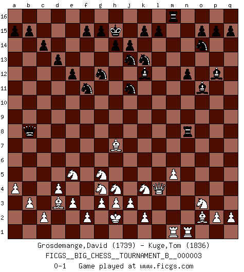 Last move : 0-1 2011 November 14 12:45:22 [Event "FICGS__BIG_CHESS__TOURNAMENT_B__000003"] [Site "FICGS"] [Date "2011.08.24"] [Round "1"] [White "Grosdemange,David"] [Black "Kuge,Tom"] [Result "0-1"] [WhiteElo "1739"] [BlackElo "1836"] 1.j2-k4 p16-o14 2.p1-o3 j15-k13 3.b1-c3 e15-e13 4.m2-m4 d15-d13 5.d2-d4 g16-f14 6.h2-g4 n15-n13 7.c1-h6 m15-m13 8.e2-e3 h15-j13 9.f1-d3 b16-c14 10.l1-o4 l16-p12 11.k1-h2 k16-l14 12.g1-f3 f16-d14 13.n2-n3 o16-k12 14.o1-h7 c16-l8 15.o4-p3 e13-e12 16.h1-l4 d14-h10 17.f3-h4 c14-e13 18.h6-k8 j13-g12 19.m4-m5 h10-g9 20.m5-m6 c15-c14 21.m6-m7 l8-m9 22.n3-n4 h16-o10 23.n4-n5 j16-h15 24.n5-n6 m13-m12 25.n6-n7 n13-n12 26.n7-n8 m9-o11 27.c3-e4 m12-m11 28.e4-g5 o10-d10 29.h2-f3 m11-m10 30.f3-e5 m10-m9 31.j1-h2 m9-n8 32.m7-n8 m16-m1 33.e1-m1 e16-m16 34.b2-b3 e13-f11 35.a2-a4 d10-b8 36.m1-m3 m16-m3 37.l2-m3 q16-m16 38.m3-m4 l14-j13 39.m4-m5 m16-m8 40.q1-n1 a16-m16 41.h7-l10 f14-h13 42.a1-m1 g9-o2 43.p3-o2 m8-k8 44.g2-g3 h13-j11 45.l10-h7 k8-n8 0-1 This big chess game has been lost on time (started : 2011.08.24 14:53:13) Follow this game move after move (download)Pawns: they are the soul of this game, they alone form the attack and defense. (Philidor) Immer nach dem besten Zug zu suchen ist ziemlich unpraktisch. (Nigel Short) Coloca el contenido de las piezas del Ajedrez en un sombrero, agitalo vigorosamente, arrojalas en un tablero desde una altura de 30 centimetros y así obtendras el estilo de Steinitz. (H. E. Bird) Les Echecs représentent une sphère d'idées créatrices basée sur la volonté des deux protagonistes. (Smyslov) Fortune favours the audacious. (Desiderius Erasmus)