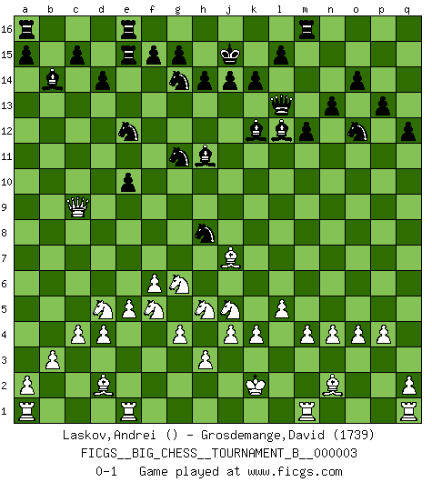Last move : 0-1 2012 January 20 6:26:38 [Event "FICGS__BIG_CHESS__TOURNAMENT_B__000003"] [Site "FICGS"] [Date "2011.08.24"] [Round "1"] [White "Laskov,Andrei"] [Black "Grosdemange,David"] [Result "0-1"] [WhiteElo ""] [BlackElo "1739"] 1.g1-f3 j15-h13 2.p1-o3 p16-o14 3.d2-d4 b16-c14 4.n2-n4 e15-e13 5.g2-g4 n15-n13 6.e2-e4 o16-k12 7.f1-c4 m15-m14 8.k2-k4 l16-n14 9.c4-d3 f16-c13 10.m2-m4 d15-d14 11.j2-g3 g16-f14 12.h1-p8 q16-p16 13.c1-d2 c16-j10 14.j3-j4 k16-l14 15.k1-j3 q15-q14 16.j3-h5 h16-l13 17.l2-l4 n14-l12 18.p8-b8 c13-b14 19.b1-c3 j16-j15 20.l1-g5 h15-g13 21.h2-k3 o14-m13 22.b2-b3 l14-j13 23.o1-n2 e13-e12 24.j1-k2 e12-e11 25.g5-j7 e11-e10 26.f3-e5 e16-e12 27.e5-g6 m16-e16 28.f2-f4 k15-k14 29.g6-h8 j10-h11 30.c3-d5 o15-o14 31.f4-f5 p15-p13 32.o3-n5 q14-q13 33.o2-o4 q13-q12 34.e4-e5 m13-o12 35.f5-f6 m14-m13 36.c2-c4 m13-m12 37.l4-l5 p16-m16 38.p2-p4 f14-d13 39.k3-j5 d13-e11 40.d3-j8 e12-e15 41.b8-c8 e11-f9 42.j5-g6 h13-g11 43.j8-c14 b15-c14 44.c8-c14 g13-e12 45.g3-f5 j13-g14 46.n5-l4 h11-d15 47.c14-c9 d15-h11 48.l4-j5 f9-h8 0-1 This big chess game has been lost on time (started : 2011.08.24 14:53:13) Follow this game move after move (download)Up to this point White has been following well-known analysis. But now he makes a fatal error: he begins to use his own head. (Siegbert Tarrasch) Ich habe Putins Aufstieg an die Macht beobachtet und seine Politik, die demokratischen Institutionen meines Landes zu zerstören. (Garry Kasparov) El Ajedrez expande y enriquece tu mente. (Saudin Robovic) Les Echecs ont trois composantes : le temps, l'espace et le matériel en dernier. (Mikhail Tal) Remember : Your focus determines your reality. (Qui-Gon Jinn in Star Wars ep.1)