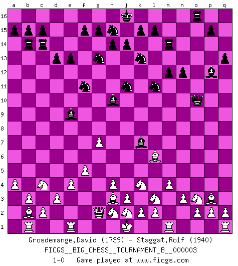 Last move : 1-0 2012 January 4 5:33:36 [Event "FICGS__BIG_CHESS__TOURNAMENT_B__000003"] [Site "FICGS"] [Date "2011.08.24"] [Round "1"] [White "Grosdemange,David"] [Black "Staggat,Rolf"] [Result "1-0"] [WhiteElo "1739"] [BlackElo "1940"] 1.j2-k4 j15-k13 2.m2-m4 b16-c14 3.h1-o7 h15-g13 4.o7-o15 p16-o14 5.o15-b3 e15-e13 6.b1-c3 d15-d13 7.p1-o3 m15-m13 8.l1-p5 n15-n13 9.n2-n3 f16-b12 10.o1-b13 o16-f8 11.k1-l3 h16-o10 12.g2-g3 c16-j10 13.b3-b7 k16-h15 14.g1-j2 l16-p12 15.h3-h4 q16-o16 16.f1-h3 e16-e14 17.d2-d3 c14-d12 18.b13-k5 e14-b14 19.b7-g2 o14-n12 20.p5-o4 a16-e16 21.e2-e4 g16-f14 22.g3-g4 b12-e9 23.f2-f4 f14-g12 24.f4-f5 g12-j11 25.c3-d5 d12-f11 26.b2-b3 j10-l8 27.c1-b2 m13-m12 28.a2-a4 l8-k7 29.o4-p3 n12-l11 30.a1-b1 e16-e14 31.d5-e3 e14-c14 32.e3-c4 m16-m14 33.g4-g5 q15-q13 34.g5-g6 n13-n12 35.g6-g7 f8-h10 36.k5-l6 1-0 This big chess game has been lost on time (started : 2011.08.24 14:53:13) Follow this game move after move (download)Chess is not like life... it has rules ! (Mark Pasternak) Ohne ihre Erfolge schmälern zu wollen würde ich sagen Petrosian, Spassky und Karpov verdanken ihre Siege ihren Trainern - Boleslavsky, Bondarevsky und Furman. (Mikhail Moiseyevich Botvinik) Del Ajedrez se ha dicho que la vida no es lo suficientemente larga para él, pero eso es culpa de la vida, no del Ajedrez. (William Ewart Napier) Un footballeur joue avec ses pieds, parfois avec sa tête. Un joueur d'échecs ne joue qu'avec sa tête. Et quand il ne joue plus, il meurt. (Jacob Murray) Thus, what is of supreme importance in war is to attack the enemy's strategy. (Sun Tzu)