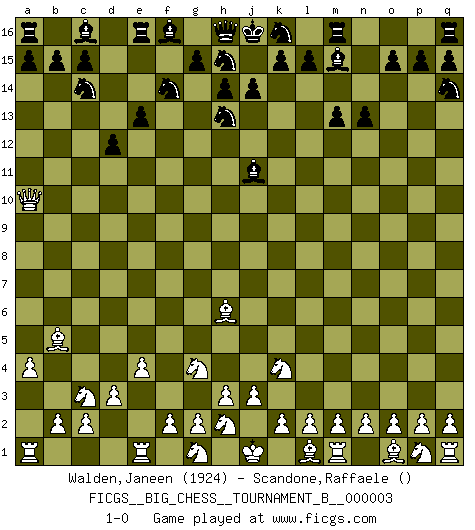 Last move : 1-0 2011 October 6 23:30:40 [Event "FICGS__BIG_CHESS__TOURNAMENT_B__000003"] [Site "FICGS"] [Date "2011.08.24"] [Round "1"] [White "Walden,Janeen"] [Black "Scandone,Raffaele"] [Result "1-0"] [WhiteElo "1924"] [BlackElo ""] 1.j2-k4 n15-n13 2.h1-o7 p16-q14 3.o7-f15 g16-f14 4.f15-a10 b16-c14 5.h2-g4 j15-h13 6.e2-e4 d15-d13 7.b1-c3 m15-m13 8.f1-b5 l16-m15 9.a2-a4 e15-e13 10.k1-h2 d13-d12 11.d2-d3 o16-j11 12.c1-h6 1-0 This big chess game has been lost on time (started : 2011.08.24 14:53:13) Follow this game move after move (download)The most important feature of the Chess position is the activity of the pieces. This is absolutely fundamental in all phases of the game: Opening, Middlegame and especially Endgame. The primary constraint on a piece's activity is the Pawn structure. (Michael Stean) Kleine Schachspieler machen Mist, und große Schachspieler machen Mist, aber große machen weniger Mist. (Fritz Sämisch) Nada excita más a Grandes Maestros aburridos que una novedad teórica. (Dominic Lawson) Il vaut toujours mieux jouer un plan faux de façon logique que de n'avoir pas de plan du tout. (Victor Kortchnoï) Imagination is more important than knowledge. Knowledge is limited. Imagination encircles the world. (Albert Einstein)