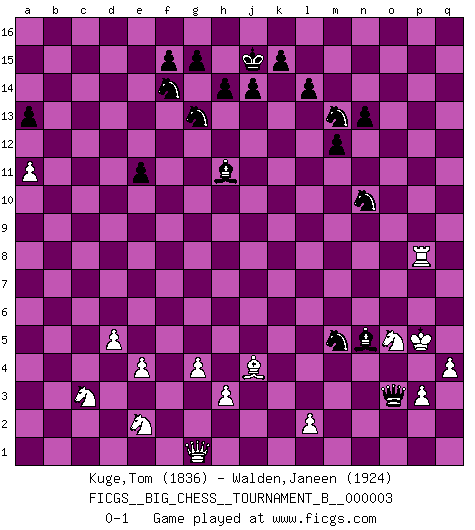 Last move : 0-1 2011 October 9 2:27:25 [Event "FICGS__BIG_CHESS__TOURNAMENT_B__000003"] [Site "FICGS"] [Date "2011.08.24"] [Round "1"] [White "Kuge,Tom"] [Black "Walden,Janeen"] [Result "0-1"] [WhiteElo "1836"] [BlackElo "1924"] 1.j2-k4 h15-g13 2.n2-n4 j15-k13 3.p1-o3 m15-m13 4.b1-c3 p16-o14 5.m2-m4 l16-p12 6.e2-e4 n15-n14 7.d2-d4 o16-j11 8.l1-o4 h16-o10 9.o4-c15 o10-f2 10.g1-f3 f2-p11 11.c15-k8 b16-c14 12.c1-g5 g16-j15 13.f1-c4 e15-e13 14.h1-o7 f16-b12 15.k4-m5 d15-d14 16.g5-h4 j11-m8 17.k8-l7 m8-l7 18.h4-l7 p11-o11 19.o7-p6 c16-h11 20.f3-h4 a16-c16 21.k1-l3 k16-h15 22.e1-f1 q15-q13 23.o1-k5 e16-e14 24.j1-j2 c14-d12 25.c4-h9 d12-f11 26.p6-b6 a15-a13 27.k5-l6 e13-e12 28.g2-g4 m16-m14 29.a2-a4 m14-l14 30.d4-d5 j15-h13 31.h2-j4 j16-j15 32.a4-a5 c16-c14 33.a5-a6 q16-c16 34.a6-a7 h13-j11 35.h9-f7 f11-e9 36.f7-a12 c14-c15 37.a7-a8 e14-f14 38.f1-f14 h15-f14 39.a8-a9 c15-c7 40.a9-a10 c7-l7 41.m5-l7 l14-l7 42.m4-m5 p12-q11 43.l6-q11 o11-q11 44.a10-a11 b12-d10 45.b6-b15 l7-l8 46.b15-a14 l8-p8 47.a14-d14 e12-e11 48.p2-p3 p8-b8 49.a1-a2 q11-q10 50.a12-g6 q10-o12 51.o3-m4 o12-d2 52.j2-k3 d2-c2 53.m1-c1 c2-b3 54.c1-a1 b3-b7 55.d14-m6 c16-b16 56.j4-g3 b7-c7 57.g3-e2 b8-b2 58.m6-p9 m13-m12 59.p9-p15 o14-m13 60.p15-o15 c7-n7 61.o15-q13 e9-g8 62.q1-b1 b2-b8 63.b1-b8 b16-b8 64.a2-a8 g8-j7 65.a8-b8 d10-b8 66.g6-j4 b8-e5 67.a1-a3 n7-o6 68.m4-o5 o6-k6 69.k3-j2 k6-o2 70.q13-q14 l15-l14 71.q2-q4 n14-n13 72.a3-a7 j11-k9 73.h4-k5 j7-k5 74.l3-k5 o2-n1 75.k5-l3 k13-l11 76.q14-e3 n1-j1 77.j2-k3 j1-h1 78.l3-j2 h1-n1 79.j2-l3 n1-h1 80.k3-k4 e5-b8 81.a7-a8 b8-d10 82.k4-l5 h1-p1 83.l5-m6 p1-k6 84.m6-n7 k6-k2 85.a8-n8 k2-j3 86.n7-o6 d10-l3 87.n4-n5 k9-l7 88.n8-m8 l11-n10 89.m8-p8 l7-m5 90.o6-p5 l3-n5 91.e3-g1 j3-o3 0-1 Follow this game move after move (download)No Chess Grandmaster is normal; they only differ in the extent of their madness. (Viktor Korchnoi) Vielleicht wirkt die Aura früherer Spieler glanzvoller als die der heutigen Spieler, aber das liegt daran, dass man kein Programm wie Fritz hatte, das einem all die Löcher in ihren Partien zeigt. (Vladimir Kramnik) Bobby es el jugador de Ajedrez mas fino que este país jamás haya producido. Su memoria para las movidas, su brillantez en soñar combinaciones y su feróz determinación por la victoria son algo extraño. (John Collins) Je fais ceci parce que dans cinquante coups j'obtiendrai cela; je m'appelle Mikhail Moisevitch Botvinnik. (Botvinnik) In fact if nothing is done against this teddy bear, hereby I announce that I would quit chess, rapid chess, blitz chess, postal chess, email chess, server chess and correspondence chess I will then switch to a table game where teddy bears aren't going to be seen for a while, like Poker, or Roulette, all 18+ games. (Elmer Valderrama)
