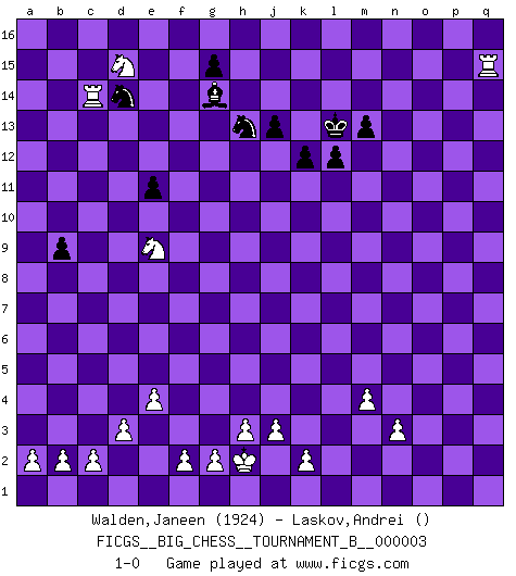 Last move : 1-0 2012 February 11 19:22:13 [Event "FICGS__BIG_CHESS__TOURNAMENT_B__000003"] [Site "FICGS"] [Date "2011.08.24"] [Round "1"] [White "Walden,Janeen"] [Black "Laskov,Andrei"] [Result "1-0"] [WhiteElo "1924"] [BlackElo ""] 1.j2-k4 k16-l14 2.h1-o7 h15-g13 3.o7-o15 p16-o14 4.o15-c4 b16-c14 5.h2-g4 g16-f14 6.k1-h2 d15-d14 7.b1-c3 e15-e13 8.p1-o3 n15-n14 9.m2-m4 m15-m13 10.l1-p5 f16-e15 11.n2-n3 c16-d15 12.o1-j6 l16-m15 13.e2-e4 j15-h13 14.c4-b3 a16-b16 15.f1-b5 o16-f8 16.g1-j2 h16-o10 17.d2-d3 d15-p4 18.p5-q4 p4-o3 19.p2-o3 o10-o3 20.q4-p3 q16-o16 21.c1-h6 f8-k12 22.e1-e3 k15-k13 23.b5-c4 o14-n12 24.c4-h9 o3-o14 25.e3-f3 j16-k15 26.h2-k3 f14-h15 27.a1-e1 p15-p13 28.m1-m3 h15-k14 29.q1-p1 q15-q13 30.j6-q13 f15-f13 31.q13-k7 e13-e12 32.f3-f5 e15-f14 33.j1-h2 g13-j12 34.m3-l3 l14-j13 35.p3-o4 k14-l12 36.p1-p3 k12-n15 37.e1-p1 o14-q14 38.f5-k5 h13-j11 39.h9-d5 d14-d13 40.o4-c15 q14-q2 41.c15-b16 o16-o2 42.b16-o4 q2-q11 43.k7-l6 q11-o13 44.k4-m3 o2-q2 45.p3-p13 n15-p13 46.o4-q2 e16-b16 47.q2-b16 m16-b16 48.h6-p13 n12-p13 49.b3-b7 l12-k14 50.p1-p5 l15-l13 51.p5-o5 o13-q15 52.l6-m7 q15-n15 53.m7-f13 a15-a14 54.f13-j10 j12-g13 55.k5-n5 l13-l12 56.l3-l5 n15-m14 57.b7-p7 p13-n12 58.o5-o15 g13-j12 59.p7-m7 m14-l13 60.m7-q3 k15-l14 61.o15-q15 j13-k15 62.q15-q16 k14-l16 63.q3-q8 b16-h16 64.q8-l13 j12-l13 65.j2-h4 l13-j12 66.m3-k4 k15-m14 67.n5-q5 j12-l13 68.d5-b7 h14-h13 69.l5-b5 b15-b13 70.b5-c5 c14-e13 71.c5-c15 e13-c12 72.j10-e14 c12-b14 73.c15-c14 h16-b16 74.q5-a5 b14-a12 75.c14-a14 l13-j12 76.e14-d13 a12-c11 77.d13-b11 j12-g13 78.a14-a16 b16-a16 79.a5-a16 j11-g12 80.b7-g12 h13-g12 81.b11-g6 n12-l13 82.k3-j5 g13-e14 83.g6-k9 e14-c15 84.a16-c16 c11-d13 85.k9-g12 b13-b12 86.g12-f13 e12-e11 87.f13-e12 b12-b11 88.e12-d13 c15-d13 89.c3-d5 l13-j12 90.k4-j6 k13-k12 91.l2-l4 j12-g13 92.d5-f6 g13-e12 93.j5-h7 e12-d14 94.c16-b16 b11-b10 95.j6-k8 d13-f12 96.h4-j6 l14-l15 97.g4-h6 m15-f9 98.j6-h8 f9-e10 99.h7-g9 e10-l4 100.h6-f7 d14-c12 101.f6-e8 f12-d11 102.k8-j10 j14-j13 103.j10-g11 d11-f12 104.g11-e12 f14-e13 105.b16-e16 l4-d11 106.e12-c13 d11-g14 107.e16-a16 e13-d14 108.c13-a12 g14-e12 109.a16-a15 d14-e13 110.f7-e9 m14-k13 111.h8-j10 l16-j15 112.j10-g11 e12-g14 113.g9-f11 e13-f14 114.e8-g9 k13-j11 115.g11-e10 j11-h13 116.q16-q15 l15-k14 117.q15-n15 g14-e16 118.n15-n14 k14-l13 119.n14-n15 f12-e10 120.g9-e10 e16-g14 121.e10-g11 b10-b9 122.g11-h13 j15-h13 123.a12-c13 l13-m14 124.n15-q15 m14-l13 125.c13-d15 f14-c11 126.a15-c15 c11-e9 127.f11-e9 c12-d14 128.c15-c14 1-0 Follow this game move after move (download)Spassky will not be psyched out by Fischer. (Mike Goodall) Ich liebe den Moment, wenn ich das Ego meines Gegenüber breche. (Robert James Fischer) Creo que una cierta cantidad de temperamento es esperada de los genios del Ajedrez. (Ron Gross) On entre au jeu d'Echecs comme on entre en Religion. Pour le joueur d'Echecs, la partie d'Echecs c'est l'office, la messe, le défilé du 1er Mai, le dépôt de gerbe au Monument aux Morts. C'est un drame sacré. (Michel Roos) To err is human, but to really foul things up requires a computer. (Farmer's Almanac, 1978)