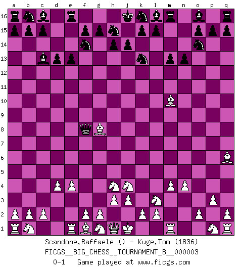 Last move : 0-1 2011 October 6 11:30:0 [Event "FICGS__BIG_CHESS__TOURNAMENT_B__000003"] [Site "FICGS"] [Date "2011.08.24"] [Round "1"] [White "Scandone,Raffaele"] [Black "Kuge,Tom"] [Result "0-1"] [WhiteElo ""] [BlackElo "1836"] 1.n2-n4 j15-k13 2.j2-h4 p16-o14 3.d2-d4 n15-n13 4.o1-g8 m15-m13 5.m2-m4 d15-d13 6.e2-e4 e15-e13 7.l1-q6 g16-f14 8.c1-m10 f16-c13 9.h2-j4 h16-p9 10.p2-p3 p9-l13 11.k1-l3 l13-f8 0-1 This big chess game has been lost on time (started : 2011.08.24 14:53:13) Follow this game move after move (download)In Chess, at least, the brave inherit the earth. (Edmar Mednis) Du musst nicht gut spielen, es reicht, wenn du besser spielst als dein Gegner. (Anonymous) Todos los Maestros de Ajedrez fueron un día unos principiantes. (Chernev) Ce n'est pas pour s'amuser qu'il joue aux échecs : il célèbre un culte. (Vladimir Nabokov) Wisdom doesn't necessarily come with age. Sometimes age just shows up all by itself. (Tom Watson)