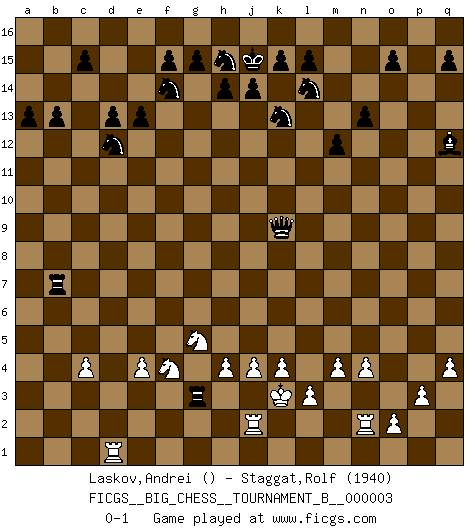 Last move : 0-1 2011 November 26 15:29:13 [Event "FICGS__BIG_CHESS__TOURNAMENT_B__000003"] [Site "FICGS"] [Date "2011.08.24"] [Round "1"] [White "Laskov,Andrei"] [Black "Staggat,Rolf"] [Result "0-1"] [WhiteElo ""] [BlackElo "1940"] 1.g1-f3 j15-k13 2.p1-o3 p16-o14 3.d2-d3 b16-c14 4.j2-k4 e15-e13 5.e2-e4 d15-d13 6.p2-p3 m15-m13 7.o1-p2 g16-f14 8.m2-m4 n15-n13 9.l1-p5 f16-b12 10.c1-p13 k16-l14 11.h1-o7 c16-e14 12.p13-o14 p15-o14 13.o7-o14 o16-f8 14.l2-l3 l16-n14 15.f1-e2 h16-n11 16.q1-n1 q16-p16 17.n2-n4 f8-n15 18.o14-o7 m13-m12 19.b1-c3 n14-k11 20.o7-j2 j16-j15 21.j3-j4 m16-m14 22.k1-j3 n15-q12 23.g2-g3 e14-p4 24.q2-q3 p4-o3 25.p2-o3 p16-p5 26.k2-k3 e16-p16 27.j1-k2 m14-o14 28.n1-n3 p5-p7 29.k4-m3 n11-q8 30.k3-k4 b12-h6 31.q3-q4 h6-g7 32.m1-m2 q8-b8 33.a1-b1 c14-d12 34.f3-d2 a16-d16 35.j3-h5 g7-l11 36.o3-p2 d16-d14 37.p2-q3 d14-a14 38.d2-b3 l11-c3 39.b2-c3 a14-a2 40.b3-d4 b8-c9 41.h3-h4 c9-c3 42.j2-d7 p7-d7 43.h5-f4 c3-d4 44.h2-g4 a2-c2 45.k2-j3 k11-m9 46.f2-f3 d4-d6 47.g4-h2 p16-p10 48.m3-k2 b15-b14 49.h2-f1 d6-f6 50.k2-h3 m9-f3 51.n3-n2 f3-e2 52.m2-e2 c2-e2 53.e1-e2 a15-a13 54.f1-e3 o14-o10 55.e3-d5 f6-l6 56.j3-k3 o10-l10 57.e2-l2 l10-a10 58.b1-c1 p10-c10 59.c1-d1 d7-j7 60.l2-j2 b14-b13 61.f4-h5 j7-b7 62.h5-f4 l6-g10 63.h3-g5 a10-a3 64.q3-k9 g10-k7 65.d5-e3 k7-k9 66.e3-c4 c10-c4 67.d3-c4 a3-g3 0-1 Follow this game move after move (download)I look one move ahead... the best ! (Siegbert Tarrasch) Das Spiel gibt uns die Genugtuung, die das Leben uns versagt. (Emanuel Lasker) El Ajedrez es un terrible juego. Si no controlas el centro, tu oponente tiene una posición mas holgada. Si tienes control del centro, ¡entonces realmente tu tienes algo de que preocuparte!. (Siegbert Tarrasch) Aidez vos pièces, elles vous aideront. (Paul Morphy) A good programmer is someone who always looks both ways before crossing a one-way street. (Doug Linder)