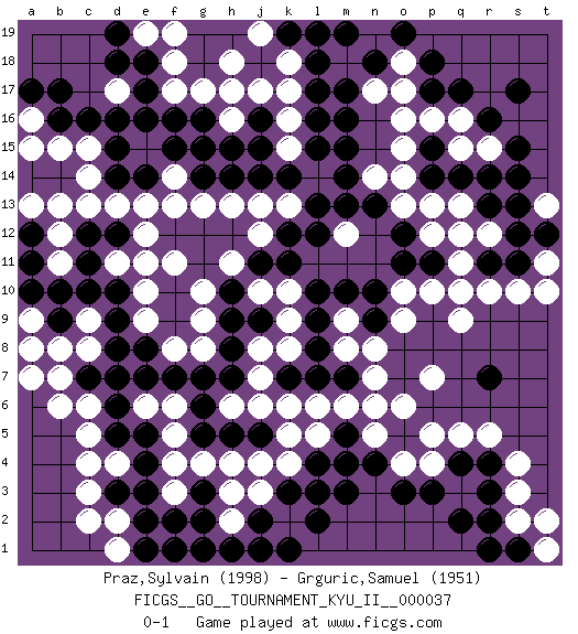 Last move : 0-1 2011 November 11 22:17:9 [Event "FICGS__GO__TOURNAMENT_KYU_II__000037"] [Site "FICGS"] [Date "2011.08.25"] [Round "1"] [Black "Praz,Sylvain"] [White "Grguric,Samuel"] [Result "0-1"] [Rating 1 "1998"] [Rating 2 "1951"] 1.r16 q5 2.c16 k16 3.h17 p16 4.p17 o17 5.q17 o16 6.r14 d13 7.e16 c9 8.e3 c4 9.d5 c5 10.d6 c6 11.d7 c8 12.l4 q3 13.o3 r10 14.m17 k17 15.m15 m18 16.n18 n17 17.m16 o18 18.l18 n19 19.l17 k18 20.k19 d17 21.d16 g17 22.e17 j4 23.g3 l3 24.m3 j6 25.g6 l6 26.k3 m12 27.k14 h16 28.j18 l19 29.m19 h18 30.n18 j17 31.o19 o14 32.n13 n14 33.m14 o13 34.m13 q13 35.r13 q12 36.r7 o10 37.r4 r5 38.q4 p4 39.p3 s4 40.r3 s3 41.r2 p7 42.c11 c13 43.e11 f13 44.d10 n5 45.g15 h13 46.g14 g13 47.j15 j19 48.j11 j12 49.k12 k13 50.l13 j13 51.l12 h11 52.h10 j10 53.k11 g10 54.h9 f11 55.e8 g9 56.h8 e12 57.s11 s10 58.r11 q11 59.p18 j3 60.m5 m6 61.l8 s2 62.q2 d2 63.d3 c3 64.e2 k4 65.l2 f18 66.e18 e10 67.d9 d11 68.c10 d1 69.e1 c2 70.q10 q9 71.o12 p12 72.o11 t11 73.s12 b15 74.b16 k2 75.l3 e19 76.d19 f19 77.d18 h2 78.k1 d4 79.e4 g8 80.g7 n8 81.o5 o6 82.n4 n6 83.j2 h3 84.t12 t10 85.n10 o9 86.b9 b8 87.b10 j8 88.j9 k9 89.h7 k8 90.l9 k10 91.l10 g4 92.g2 f5 93.h5 h4 94.j5 k5 95.k7 j7 96.l7 k6 97.e5 f6 98.f7 e9 99.d8 b12 100.h1 c15 101.a8 b7 102.d15 r12 103.s14 a16 104.a17 a15 105.b17 p5 106.p11 p10 107.c7 b6 108.s1 t2 109.n9 m8 110.c12 m9 111.m10 f8 112.g5 f4 113.d12 f3 114.f2 g1 115.f1 a7 116.a11 a9 117.d14 c14 118.e14 e13 119.a12 a13 120.m7 n7 121.q14 f14 122.f15 h15 123.g16 k15 124.j14 f17 125.h14 o4 126.p14 p13 127.p15 o15 128.j16 q16 129.h17 t13 130.s13 r15 131.s15 q15 132.s17 h16 133.l15 l5 134.m4 e11 135.l19 b13 136.a10 a8 137.e7 q10 138.h15 h17 139.f16 t1 140.r1 b11 141.l16 h6 142.j1 e6 143.g1 pass 0-1 Here are the names of the openings (joseki) played in the four corners : Corner q16 : r16 p16 Komoku (Somok, Xiao~mu`) 3-4 Point. The komoku (3-4) point is the traditional corner enclosure move.. Ikken Takagakari (Hankan Nop'dakeolch'im, Yi Gaogua`jiao~, 1-Space High Approach). The 5-4 approach move has become more popular in modern times, as modern Go emphasizes speed and influence. Corner d4 : c9 e3 This joseki is unknown. A weak or weird move has probably been played in this corner. Corner q4 : q5 l4 Takamoku (Gomok, Gaomu`) 5-4 Point. The takamoku (high) point (5-4). With its emphasis on influence, the 5-4 point complements the 4-4 (hoshi) point in creating an influence-oriented fuseki. Player White won this Go (weiqi, baduk) game. Follow this game move after move (download)You don't have to be really good anymore to get good results. What's happening with chess is that it's gradually losing its place as the par excellence of intellectual activity. Smart people in search of a challenging board game might try a game called Go. (Hans Berliner, The New York Times, 2003) Rules and bones are meant to be broken. (Anonymous)