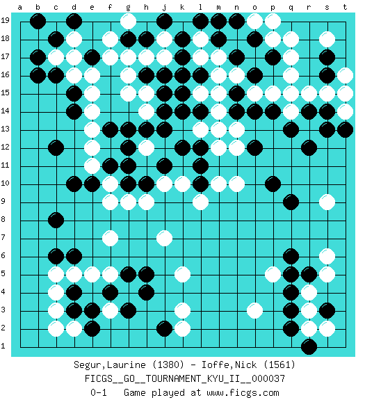 Last move : 0-1 2012 March 4 1:53:14 [Event "FICGS__GO__TOURNAMENT_KYU_II__000037"] [Site "FICGS"] [Date "2011.08.25"] [Round "1"] [Black "Segur,Laurine"] [White "Ioffe,Nick"] [Result "0-1"] [Rating 1 "1380"] [Rating 2 "1561"] 1.d4 q16 2.q4 d16 3.c8 k3 4.k17 h17 5.o16 q14 6.q9 o3 7.c12 f3 8.b16 c17 9.e17 e16 10.c16 f17 11.c18 d18 12.b17 d17 13.b19 p18 14.p17 q17 15.j16 r3 16.q3 r4 17.q6 s6 18.r12 c3 19.d3 c4 20.c6 d2 21.e2 c2 22.e3 d5 23.f4 c5 24.d6 e5 25.g3 k5 26.j2 k2 27.r5 s5 28.s3 r2 29.q2 p5 30.q5 s2 31.r1 s9 32.r14 r15 33.s13 m17 34.n17 m16 35.o14 m14 36.o12 m12 37.p10 e12 38.d14 e14 39.d15 e15 40.k14 l18 41.o18 q18 42.s16 s15 43.s17 s18 44.t15 t14 45.s14 t16 46.t13 t15 47.q13 f5 48.g5 f7 49.d10 f10 50.h4 j7 51.h5 n10 52.k12 k10 53.l11 n12 54.h13 h15 55.l16 l15 56.j11 j10 57.h10 h9 58.f11 e11 59.f13 e13 60.g10 g9 61.g11 h12 62.g12 h14 63.j14 l13 64.k15 k13 65.l14 m15 66.j13 m10 67.h16 g16 68.g13 j17 69.j15 g15 70.l12 n13 71.m13 l13 72.l10 l9 73.e10 f9 74.k18 j18 75.m18 k19 76.m19 l17 77.k16 o15 78.n15 p15 79.p14 q15 80.n14 n16 81.l19 m13 82.j19 o19 83.n19 p19 84.h18 g17 85.g18 f18 86.d19 g19 0-1 Here are the names of the openings (joseki) played in the four corners : Corner q16 : q16 o16 Hoshi (Hwajeom, Seongjeom, Xingwei`) 4-4 Point. The star or hoshi (4-4) point, emphasizing influence at the potential expense of territory. Ikken Takagakari (Hankan Nop'dakeolch'im, Yi Gaojia, 1-Space High Approach). White typically responds at 6-4 or 3-10. White 4-10 is played when White finds play on the right side advantageous. White 4-8 or 3-8 may be played when White has support at top. Player White won this Go (weiqi, baduk) game. Follow this game move after move (download)Dead group ? Always win ko fights ! (Anonymous) Only sick music makes money today. (Friedrich Nietzsche)
