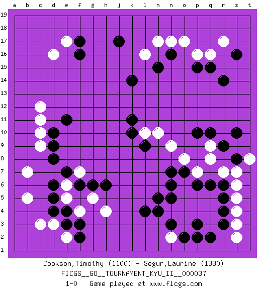 Last move : 1-0 2012 March 4 1:51:46 [Event "FICGS__GO__TOURNAMENT_KYU_II__000037"] [Site "FICGS"] [Date "2011.08.25"] [Round "1"] [Black "Cookson,Timothy"] [White "Segur,Laurine"] [Result "1-0"] [Rating 1 "1100"] [Rating 2 "1380"] 1.d4 q16 2.r4 d16 3.r14 c12 4.f17 h4 5.j17 m17 6.n16 l16 7.m15 o17 8.p15 p16 9.k14 n17 10.d8 n4 11.p3 r7 12.l4 e17 13.r9 s5 14.p6 q8 15.p10 o8 16.m5 o5 17.n6 o6 18.o7 p7 19.n7 p5 20.r5 s4 21.q6 q5 22.r6 q4 23.r3 q3 24.q2 o3 25.o2 p4 26.p2 n2 27.n5 o4 28.m4 c9 29.f16 b7 30.d6 b5 31.n3 n9 32.l9 m10 33.k11 l10 34.k10 q9 35.q10 s6 36.s8 s7 37.s16 r17 38.d9 c11 39.d10 c10 40.e11 c3 41.f3 e2 42.f2 d3 43.e4 s3 44.q15 t8 45.s10 s2 46.h6 g5 47.g6 f4 48.e3 e5 49.d5 e6 50.e7 f7 51.f6 1-0 Here are the names of the openings (joseki) played in the four corners : Corner q16 : q16 r14 Hoshi (Hwajeom, Seongjeom, Xingwei`) 4-4 Point. The star or hoshi (4-4) point, emphasizing influence at the potential expense of territory. Ikken Kakari (Hankan Keolch'im, Yi Gua`jiao~, 1-Space Low Approach). Black 2 is the standard approach move to the 4-4. Corner d4 : d4 h4 Hoshi (Hwajeom, Seongjeom, Xingwei`) 4-4 Point. The star or hoshi (4-4) point, emphasizing influence at the potential expense of territory. Corner q4 : r4 n4 Komoku (Somok, Xiao~mu`) 3-4 Point. The komoku (3-4) point is the traditional corner enclosure move.. Player Black won this Go (weiqi, baduk) game. Follow this game move after move (download)Keshi is worth as much as an invasion ! (Anonymous) A good teacher is like a candle - it consumes itself to light the way for others. (Author unknown)
