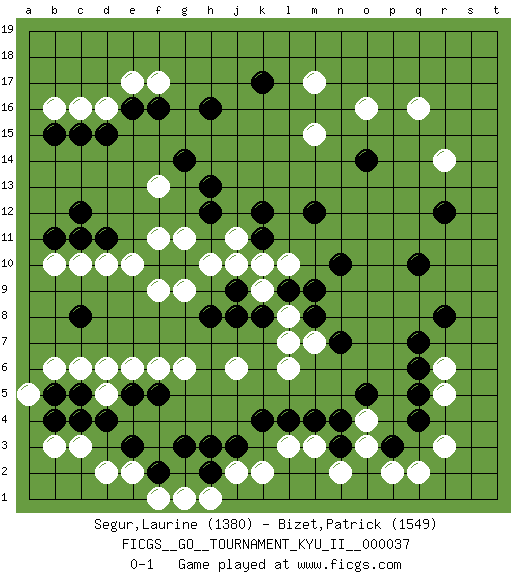 Last move : 0-1 2012 March 27 0:36:16 [Event "FICGS__GO__TOURNAMENT_KYU_II__000037"] [Site "FICGS"] [Date "2011.08.25"] [Round "1"] [Black "Segur,Laurine"] [White "Bizet,Patrick"] [Result "0-1"] [Rating 1 "1380"] [Rating 2 "1549"] 1.d4 q16 2.q4 c16 3.c8 e17 4.r8 o3 5.r12 r14 6.c12 q2 7.p3 p2 8.h3 c6 9.b5 e6 10.h16 m17 11.f16 g6 12.f5 f6 13.l4 j6 14.b15 b16 15.k17 m15 16.e16 f17 17.d15 f9 18.q10 r3 19.q6 o4 20.n4 f11 21.h13 j11 22.k12 l10 23.k11 k10 24.m12 c10 25.d11 d10 26.c15 d16 27.o14 o16 28.n10 m7 29.m9 l8 30.l9 k9 31.m8 l6 32.k8 l7 33.j8 h10 34.h8 b6 35.c5 d5 36.e5 d6 37.j9 j10 38.f10 e10 39.g10 g9 40.h12 g11 41.b11 b10 42.c11 a5 43.b4 m3 44.n3 n2 45.m4 l3 46.k4 k2 47.j3 j2 48.g3 f1 49.f2 g1 50.h2 h1 51.n7 f13 52.g14 r5 53.q5 r6 54.q7 e2 55.e3 d2 56.o5 c3 57.c4 b3 0-1 Here are the names of the openings (joseki) played in the four corners : Corner q16 : q16 r12 Hoshi (Hwajeom, Seongjeom, Xingwei`) 4-4 Point. The star or hoshi (4-4) point, emphasizing influence at the potential expense of territory. Player White won this Go (weiqi, baduk) game. Follow this game move after move (download)On the second line six die, eight live. (Anonymous) Perception is reality. (Immanuel Kant)