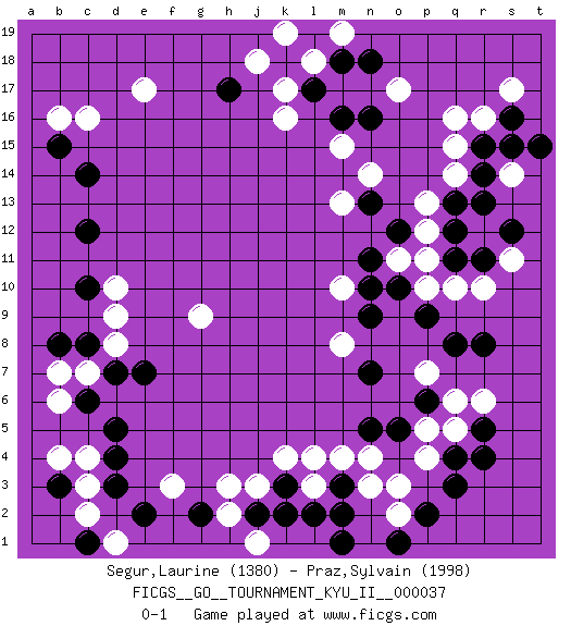 Last move : 0-1 2012 March 8 13:46:22 [Event "FICGS__GO__TOURNAMENT_KYU_II__000037"] [Site "FICGS"] [Date "2011.08.25"] [Round "1"] [Black "Segur,Laurine"] [White "Praz,Sylvain"] [Result "0-1"] [Rating 1 "1380"] [Rating 2 "1998"] 1.d4 q16 2.q4 c16 3.c8 o3 4.q8 k4 5.c12 f3 6.m16 e17 7.q12 o17 8.h17 k17 9.l17 k16 10.b15 b16 11.e2 c4 12.d5 c3 13.d3 b6 14.c6 b7 15.b8 c2 16.c1 d1 17.b3 b4 18.m3 m4 19.k3 l3 20.l2 l4 21.m1 n3 22.m2 r6 23.p6 p5 24.r5 q5 25.r4 q6 26.p2 o2 27.j2 j3 28.k2 h3 29.g2 h2 30.o1 q10 31.o10 p11 32.o12 o11 33.n11 p12 34.q13 p13 35.r15 r16 36.s16 s17 37.t15 s14 38.s15 q15 39.r14 s11 40.r11 r10 41.s12 r12 42.q11 q14 43.r13 p10 44.n9 m10 45.n10 m15 46.k18 j18 47.m18 k19 48.l19 l18 49.n18 m19 50.n16 n14 51.n13 m13 52.n7 m8 53.n5 n4 54.o5 p4 55.r8 j1 56.q3 p7 57.p9 c7 58.d7 d8 59.e7 d9 60.c10 d10 61.c14 g9 0-1 Here are the names of the openings (joseki) played in the four corners : Corner q4 : q4 o3 Hoshi (Hwajeom, Seongjeom, Xingwei`) 4-4 Point. The star or hoshi (4-4) point, emphasizing influence at the potential expense of territory. Ikken Kakari (Hankan Keolch'im, Yi Gua`jiao~, 1-Space Low Approach). White 2 is the standard approach move to the 4-4. Corner d16 : c16 c12 Komoku (Somok, Xiao~mu`) 3-4 Point. The komoku (3-4) point is the traditional corner enclosure move.. Corner q16 : q16 m16 Hoshi (Hwajeom, Seongjeom, Xingwei`) 4-4 Point. The star or hoshi (4-4) point, emphasizing influence at the potential expense of territory. Player White won this Go (weiqi, baduk) game. Follow this game move after move (download)Only amateurs try to come up with fancy moves. (Anonymous) Better than a thousand days of diligent study is one day with a great teacher. (Japanese proverb)