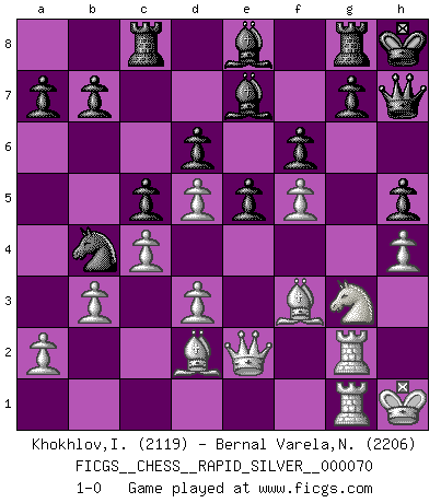 Last move : 1-0 2011 December 4 19:15:24 [Event "FICGS__CHESS__RAPID_SILVER__000070"] [Site "FICGS"] [Date "2011.08.26"] [Round "1"] [White "Khokhlov,Igor"] [Black "Bernal Varela,Nelson"] [Result "1-0"] [WhiteElo "2119"] [BlackElo "2206"] 1.e4 c5 2.Nc3 d6 3.g3 e5 4.Bg2 Nf6 5.d3 Be7 6.Nge2 O-O 7.O-O Nc6 8.h3 Bd7 9.g4 h5 10.g5 Ne8 11.h4 Bg4 12.Nd5 Nc7 13.c3 Rc8 14.f3 Bd7 15.Ne3 f6 16.g6 Qe8 17.f4 Qxg6 18.f5 Qh7 19.Ng3 Kh8 20.Bf3 Be8 21.Rf2 Rd8 22.Rg2 Rg8 23.Nd5 Nxd5 24.exd5 Nb8 25.Bd2 Rc8 26.b3 Bf7 27.c4 Be8 28.Qe2 Na6 29.Kh1 Nb4 30.Rag1 1-0 Sicilian : Closed Kingside Castling by player Black (move 6) Kingside Castling by player White (move 7) Player White won this chess game. Follow this game move after move (download)Chess is a terrible game. If you have no center, your opponent has a freer position. If you do have a center, then you really have something to worry about ! (Siegbert Tarrasch) Modernes Schach erfordert enorme Anspannung. Es ist für einen normalen Menschen unmöglich das auszuhalten. (Viktor Kortschnoi) El Ajedrez es la vida. (Bobby Fischer) Des points faibles ou des trous dans la position de l'adversaire doivent être occupés par des pièces et non pas par des pions. (Siegbert Tarrasch) Work expands to fill the time available. (C. Northcote Parkinson, in Parkinson's Laws)