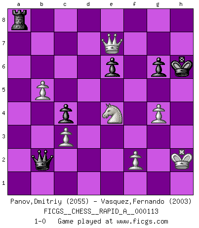 Last move : 1-0 2012 January 19 22:19:40 [Event "FICGS__CHESS__RAPID_A__000113"] [Site "FICGS"] [Date "2011.08.26"] [Round "1"] [White "Panov,Dmitriy"] [Black "Vasquez,Fernando"] [Result "1-0"] [WhiteElo "2055"] [BlackElo "2003"] 1.e4 e5 2.Nf3 Nf6 3.Nc3 Nc6 4.d4 exd4 5.Nxd4 Bb4 6.Nxc6 bxc6 7.Bd3 O-O 8.O-O d5 9.exd5 cxd5 10.Bg5 c6 11.Qf3 Bd6 12.Rfe1 Rb8 13.Rab1 Bd7 14.h3 h6 15.Bf4 Be6 16.b3 Bxf4 17.Qxf4 Re8 18.a3 c5 19.Nb5 Re7 20.b4 a6 21.Nc3 c4 22.Be2 d4 23.Rbd1 Rd7 24.Na4 Nd5 25.Qg3 Rc8 26.Rxd4 Nc3 27.Rxd7 Nxe2+ 28.Rxe2 Qxd7 29.Nc3 Rd8 30.Qf4 Qe7 31.Ne4 Rd4 32.Qb8+ Rd8 33.Qb6 Bg4 34.Re3 Bf5 35.Ng3 Be6 36.Qxa6 Qf6 37.Re2 Kh7 38.Kh2 Qb2 39.b5 Rd1 40.a4 Ra1 41.Qc6 Rxa4 42.Qe4+ g6 43.Qb7 Kg8 44.Qb8+ Kg7 45.Qc7 Bd5 46.Qc5 Be6 47.Rxe6 fxe6 48.Ne4 h5 49.c3 Ra8 50.Qe7+ Kh6 51.g4 hxg4 52.hxg4 1-0 Petrov Three knights game Kingside Castling by player Black (move 7) Kingside Castling by player White (move 8) Player White won this chess game. Follow this game move after move (download)Place the contents of the Chess box in a hat, shake them up vigorously, pour them on the board from a height of two feet, and you get the style of Steinitz. (H. E. Bird) Kein Schachspieler kann gut schlafen. (H. G. Wells) Un Peón pasado aumenta su poder a medida de que el número de piezas en el tablero disminuye. (Capablanca) Les échecs, c'est la lutte contre l'erreur. (Johannes Zukertort) Games, world of games... There's always an opponent, and there's always a victim. (Revolver, movie)