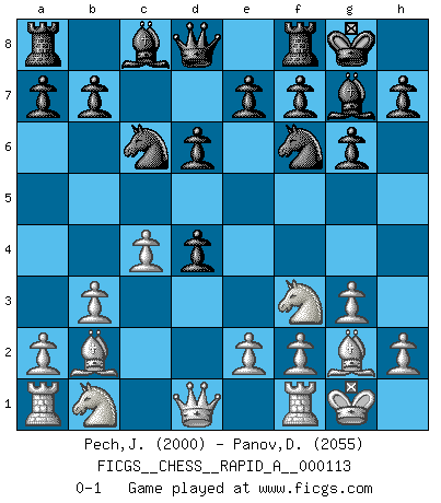 Last move : 0-1 2011 December 1 22:8:33 [Event "FICGS__CHESS__RAPID_A__000113"] [Site "FICGS"] [Date "2011.08.26"] [Round "1"] [White "Pech,Jaroslav senior"] [Black "Panov,Dmitriy"] [Result "0-1"] [WhiteElo "2000"] [BlackElo "2055"] 1.Nf3 Nf6 2.b3 g6 3.Bb2 Bg7 4.g3 O-O 5.Bg2 c5 6.c4 Nc6 7.O-O d6 8.d4 cxd4 0-1 Reti Opening Kingside Castling by player Black (move 4) Kingside Castling by player White (move 7) Player Black won this chess game. Follow this game move after move (download)Chess is a foolish expedient for making idle people believe they are doing something very clever when they are only wasting their time. (George Bernard Shaw) Wer wird heute Abend ihr Gegner sein? -- Heute Abend spiele ich gegen die schwarzen Steine. (Akiba Rubinstein) Solo puedes ser bueno en el Ajedrez si amas al juego. (Bobby Fischer) Il n'y a pas de prix trop élevé au scalp de l'ennemi. (Koblentz) All art requires courage. (Anne Tucker)