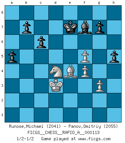 Last move : 1/2-1/2 2011 November 23 15:58:57 [Event "FICGS__CHESS__RAPID_A__000113"] [Site "FICGS"] [Date "2011.08.26"] [Round "1"] [White "Runose,Michael"] [Black "Panov,Dmitriy"] [Result "1/2-1/2"] [WhiteElo "2041"] [BlackElo "2055"] 1.d4 Nf6 2.c4 e6 3.Nf3 Bb4+ 4.Bd2 Bxd2+ 5.Qxd2 O-O 6.Nc3 d6 7.g3 Qe7 8.Bg2 e5 9.O-O Re8 10.dxe5 dxe5 11.Rfd1 Nbd7 12.Ne1 Nb6 13.b3 h6 14.Rac1 c6 15.Qd6 Qxd6 16.Rxd6 Bf5 17.e4 Be6 18.Rd2 Rad8 19.Nd3 Rd4 20.Kf1 Red8 21.Ke2 Bg4+ 22.Ke3 Be6 23.Rcd1 Ng4+ 24.Ke2 Nxc4 25.bxc4 Bxc4 26.Na4 f5 27.Nab2 Bxa2 28.Nc1 Bf7 29.exf5 Nxh2 30.Rxd4 Rxd4 31.Rxd4 exd4 32.Ke1 Kf8 33.Ne2 Ng4 34.Nxd4 Ke7 35.Nd3 Kd6 36.Kd2 Bc4 37.Bf3 Bxd3 38.Bxg4 Bc4 39.Bf3 Bf7 40.Kc3 a6 41.Kd3 a5 42.Be4 h5 43.f4 Ke7 1/2-1/2 Bogo-Indian defense Kingside Castling by player Black (move 5) Kingside Castling by player White (move 9) This chess game ended in a draw. Follow this game move after move (download)Do you realize Fischer almost never has any bad pieces? He exchanges them, and the bad pieces remain with his opponents. (Yuri Balashov) Obwohl ich alt bin, darf mir niemand den Finger in den Mund stecken, sonst beisse ich. (Wilhelm Steinitz) Nunca antes ha habido un jugador de Ajedrez con tal conocimiento a fondo de las complejidades del juego y una inmensa voluntad absolutamente indomable de ganar. Yo pienso que Fischer es el jugador mas grande que jamás haya existido. (Lisa Lane) Même un GMI sait rarement calculer sur plus de cinq coups une attaque à sacrifices. (Rudolf Spielmann) Logic : The art of thinking and reasoning in strict accordance with the limitations and incapacities of the human misunderstanding. (Ambrose Bierce)
