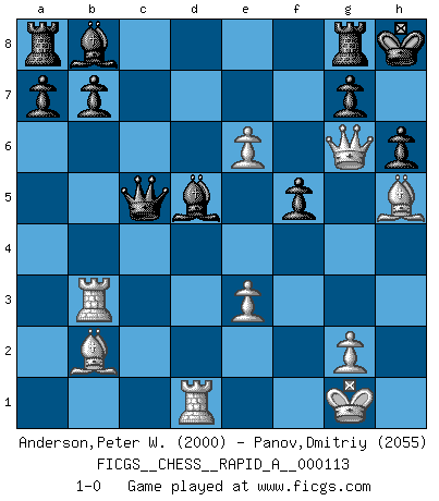 Last move : 1-0 2011 November 6 0:36:55 [Event "FICGS__CHESS__RAPID_A__000113"] [Site "FICGS"] [Date "2011.08.26"] [Round "1"] [White "Anderson,Peter W."] [Black "Panov,Dmitriy"] [Result "1-0"] [WhiteElo "2000"] [BlackElo "2055"] 1.d4 Nf6 2.c4 e6 3.Nc3 Bb4 4.e3 O-O 5.Bd3 d6 6.Nge2 c5 7.a3 Ba5 8.O-O Nc6 9.Qc2 h6 10.Rd1 Qe7 11.Ne4 Nh5 12.b4 cxb4 13.Qb3 f5 14.N4g3 Nxg3 15.hxg3 bxa3 16.Bxa3 Rd8 17.Nf4 Bc7 18.Qc2 Bb6 19.g4 Qg5 20.c5 dxc5 21.dxc5 Bc7 22.gxf5 exf5 23.Bc4+ Kh7 24.Nd5 Bb8 25.Bb2 Qg4 26.f4 Re8 27.Be2 Qg3 28.Ra3 Qg6 29.Qc3 Rg8 30.Qe1 Qe8 31.Qh4 Be6 32.Bh5 Qf8 33.Rb3 Qxc5 34.Qg3 Ne5 35.fxe5 Bxd5 36.Qg6+ Kh8 37.e6 1-0 This chess game has been lost on time (started : 2011.08.26 17:1:14) Nimzo-Indian : 4.e3 O-O, 5.Bd3 Kingside Castling by player Black (move 4) Kingside Castling by player White (move 8) Player White won this chess game. Follow this game move after move (download)We don't really know how the game was invented, though there are suspicions. As soon as we discover the culprits, we'll let you know. (Bruce Pandolfini) Die jungen Leute sollen verstehen, dass sie noch etwas von mir lernen können und müssen. (Viktor Kortschnoi) Fischer no está bajo la obligación de nadie. (Joseph Platz) Il vaut toujours mieux jouer un plan faux de façon logique que de n'avoir pas de plan du tout. (Victor Kortchnoï) The beginning of wisdom is silence. The second step is listening. (Unknown)