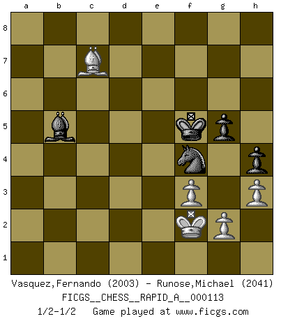 Last move : 1/2-1/2 2011 December 19 3:4:0 [Event "FICGS__CHESS__RAPID_A__000113"] [Site "FICGS"] [Date "2011.08.26"] [Round "1"] [White "Vasquez,Fernando"] [Black "Runose,Michael"] [Result "1/2-1/2"] [WhiteElo "2003"] [BlackElo "2041"] 1.e4 c5 2.d4 cxd4 3.c3 dxc3 4.Nxc3 Nc6 5.Nf3 e6 6.Bf4 Bb4 7.Rc1 Nf6 8.Bd3 d6 9.O-O Bxc3 10.Rxc3 h6 11.Bg3 e5 12.Bb5 Qc7 13.Re1 Be6 14.Rd3 Ke7 15.Nh4 g6 16.Rc3 Qb6 17.Bxc6 bxc6 18.b3 a5 19.Qc1 Ra6 20.Nf3 a4 21.Nxe5 dxe5 22.Bxe5 Rc8 23.Rd3 axb3 24.Bd6+ Ke8 25.axb3 Rd8 26.Qc3 c5 27.Bxc5 Rxd3 28.Qxd3 Qc6 29.Qd4 Bxb3 30.f3 Qc7 31.Rc1 Rc6 32.h3 g5 33.Rc3 Ng8 34.Qb4 Be6 35.Qb5 Bd7 36.Qc4 Ne7 37.Qb4 Ng6 38.Bd4 Qd6 39.Qxd6 Rxd6 40.Be3 Rc6 41.Rxc6 Bxc6 42.Kf2 f6 43.Bd4 Kf7 44.Bb6 h5 45.Bc7 Bb5 46.Bd6 Ke6 47.Bc7 Ne5 48.Bb6 Nd3+ 49.Ke3 Nf4 50.Kf2 h4 51.Bc7 Kf7 52.Bb8 Kg6 53.Bc7 f5 54.exf5+ Kxf5 1/2-1/2 Sicilian : Smith-Morra gambit Kingside Castling by player White (move 9) 10 pieces endgame at move 54 : White KBPPP , Black KBNPP WHITE : King + 1 Bishop 3 Pawns BLACK : King + 1 Bishop 1 Knight 2 Pawns This chess game ended in a draw. Follow this game move after move (download)A win by an unsound combination, however showy, fills me with artistic horror. (Wilhelm Steinitz) Kritik überlasse ich den Spießern. Ich zeige nichts, wofür ich mich schämen muss. (Alexandra Kosteniuk) El pensamiento metódico es mas útil en el Ajedrez que la inspiración. (C. J. S. Purdy) On a dit que l'homme se distingue de l'animal par le fait qu'il achète plus de livres qu'il ne peut en lire. Je voudrais suggérer qu'inclure à la liste des livres quelques livres d'échecs rendrait la distinction manifeste. (Edward Lasker) Children in the dark cause accidents, accidents in the dark cause children. (Unknown)